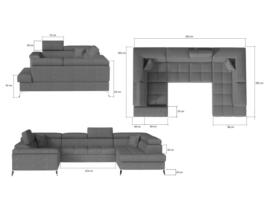 Sedačka je vyrobena v pravém provedení rohu. Je celočalouněná, vhodná i pro umístění v prostoru. Na čalounění je použita kombinace látky Monolith 29 a Monolith 09. Celkové rozměry (š/v/h): 350 x 90 x 202cm, výška sedačky bez opěrek je 70 cm. Hloubka sezení 60 cm, výška sezení 43 cm.