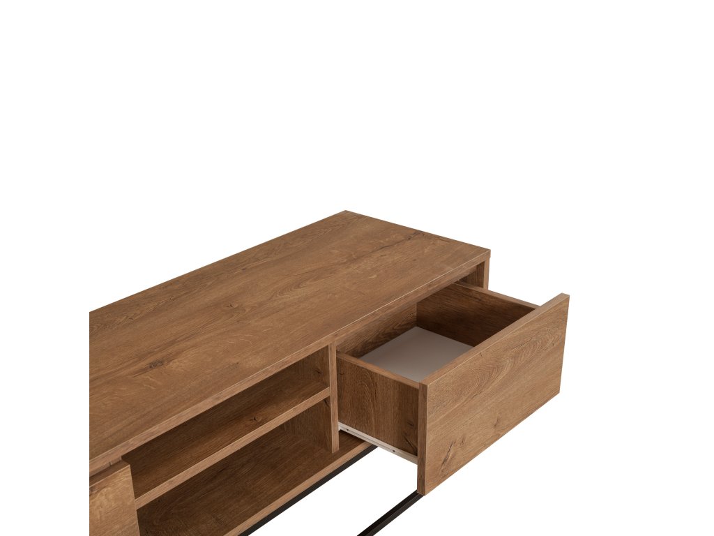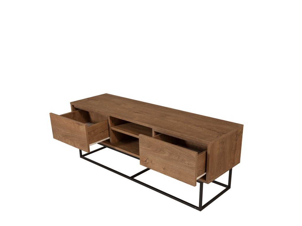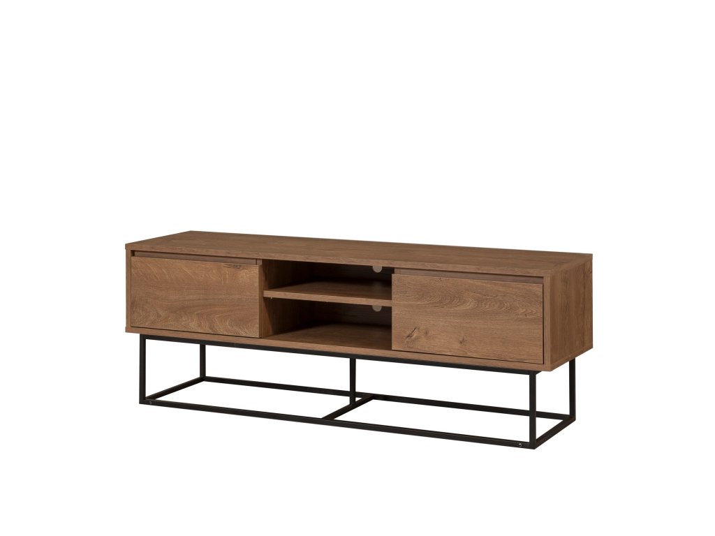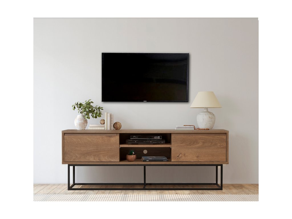 TV stolek TATE spojuje funkčnost s moderním industriálním designem. Dekor ořechu v kombinaci s černými kovovými prvky z něj činí elegantní a praktický nábytek, který skvěle doplní váš obývací pokoj.