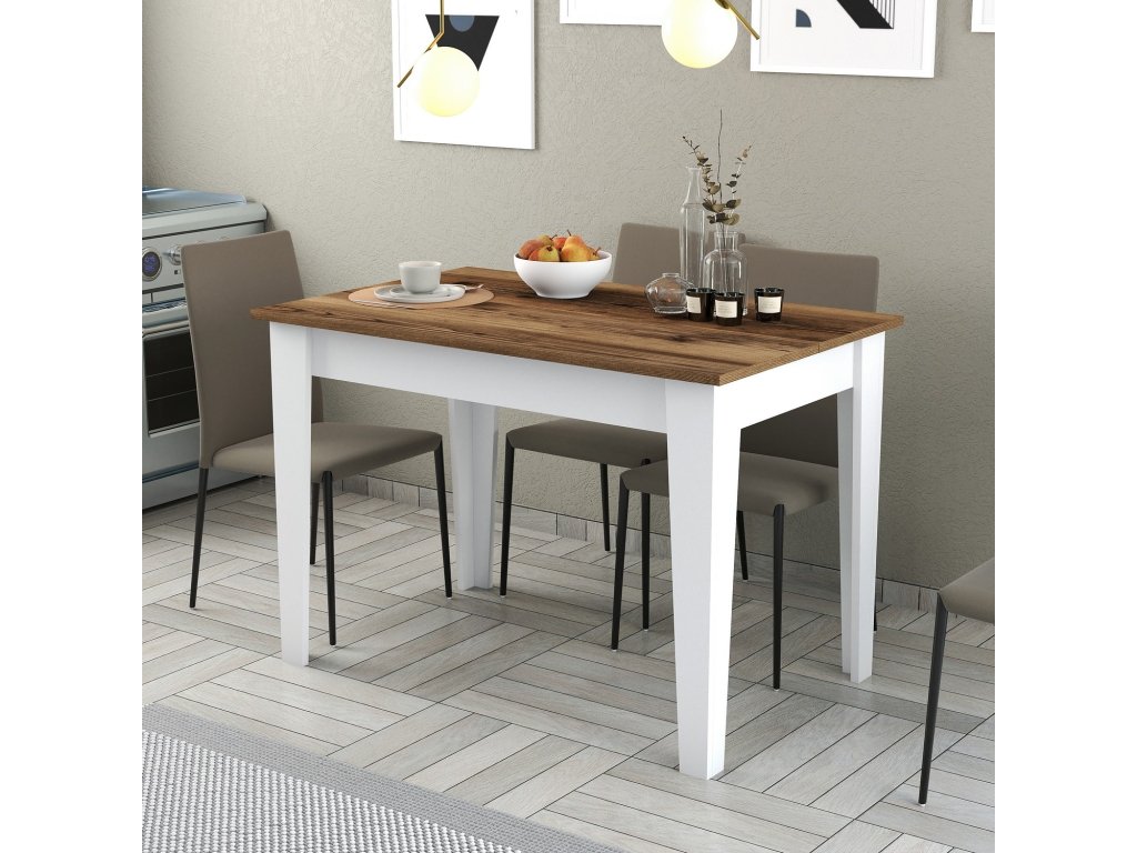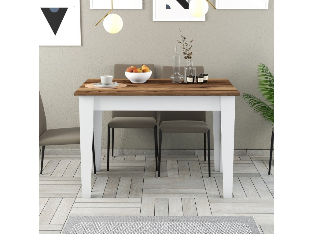 Tento kuchyňský stůl, vyrobený ze 100% dřevotřísky s melaminovým povlakem, je nejen odolný, ale také vyzařuje luxusní vzhled. Tloušťka 18 mm zajišťuje jeho robustnost, takže je ideální pro každodenní použití. Kombinace ořechového dřeva a bílé barvy dodá vaší kuchyni nádech elegance a sofistikovanosti.