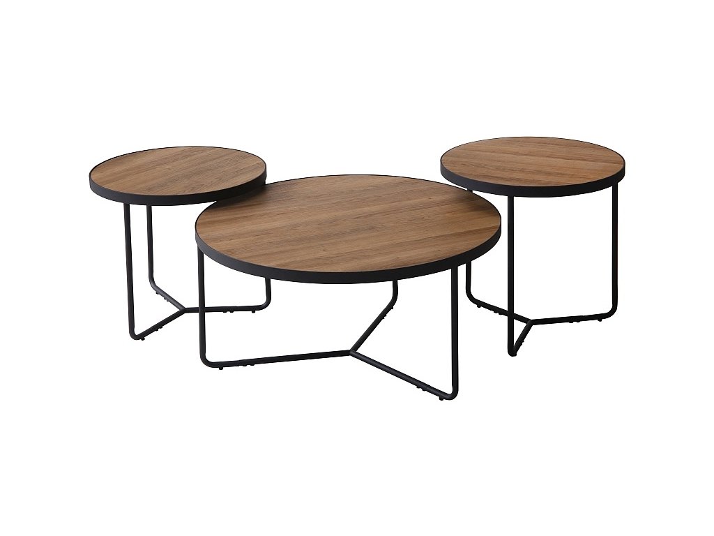 Konstrukce stolků nabízí jednoduché provedení v černé matné barvě. Horní deska je vyrobena v kombinaci MDF desky a dýhy, v barvě ořech. Největší stolek má průměr 80 cm a jeho výška je 40 cm, střední stolek má průměr 50 cm a jeho výška je 50 cm a nejmenší stolek má průměr 50 cm a jeho výška je 45 cm.