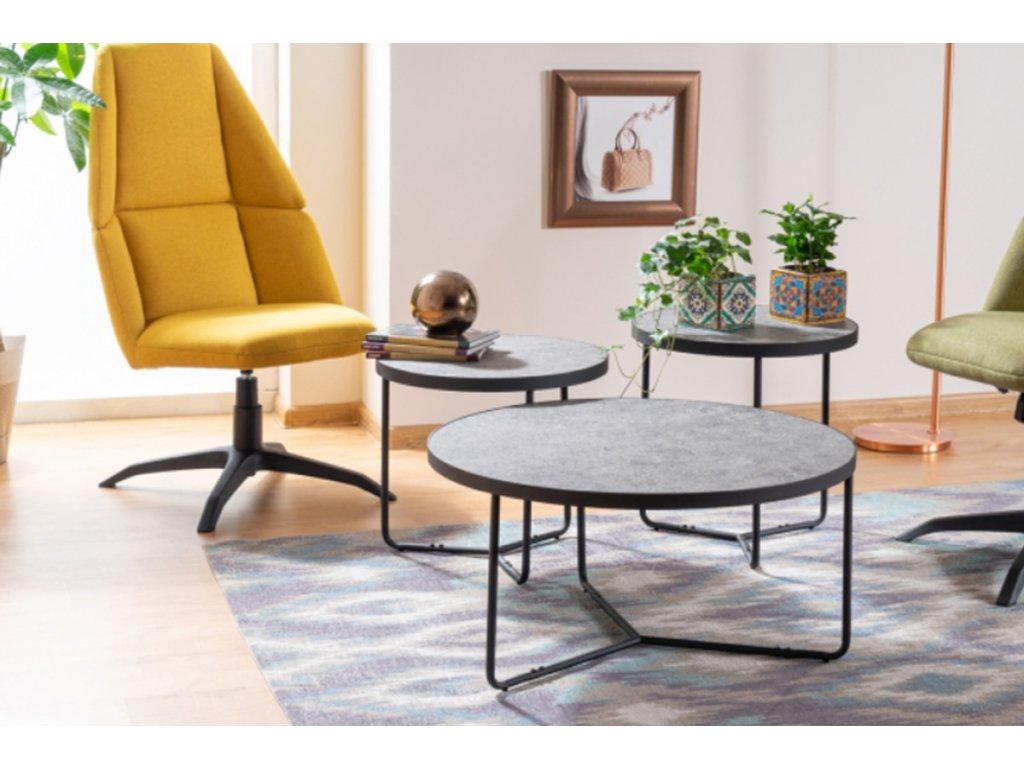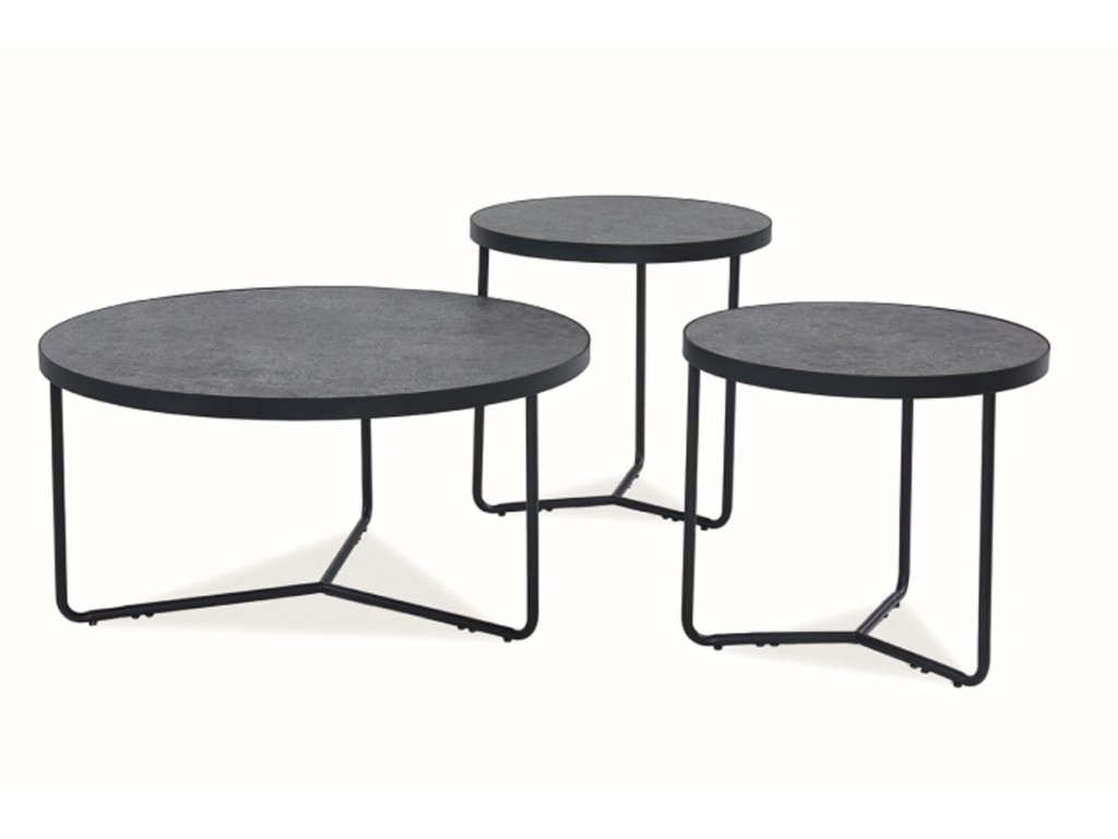 Stylová sada konferenčních stolků TEMERI je určena zastáncům industriálních prvků. Skládá se ze 3 kulatých stolků a nabízí kombinaci kovové konstrukce a desky s efektem betonu. Je určena do moderních a nadčasových interiérů, kde vytvoří stylovou kompozici. Konstrukce stolků nabízí jednoduché provedení v černé matné barvě. Horní deska je vyrobena v kombinaci MTD desky a dýhy, v šedé barvě. Největší stolek má průměr 80 cm a jeho výška je 40 cm, střední stolek má průměr 50 cm a jeho výška je 50 cm a nejmenší stolek má průměr 50 cm a jeho výška je 45 cm. Stolky si můžete libovolně umístit do prostoru a využívat je spolu i samostatně. Dodáváme v demontu.Doplňkové parametry