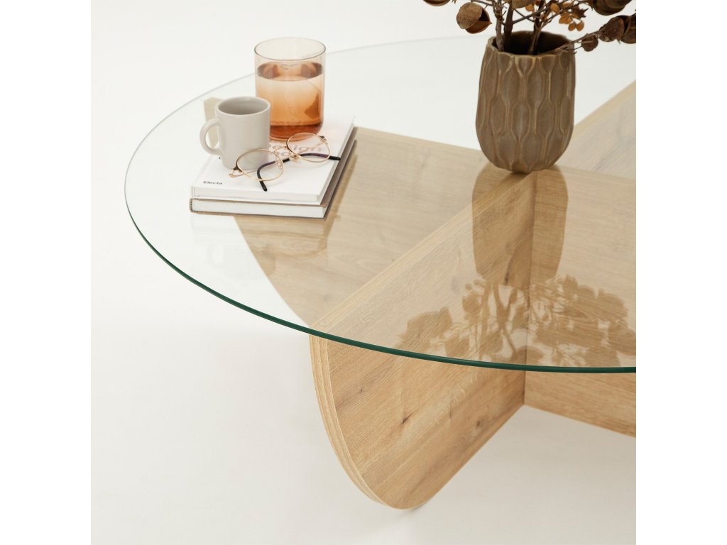 Stolek TENANT nabízí kvalitní zpracování z melaminu, VT laminátu a skla, což zajišťuje jeho odolnost a dlouhou životnost. Kulatý tvar dodává interiéru jemnost a bezpečnost, což oceníte zejména v rodinných domácnostech.