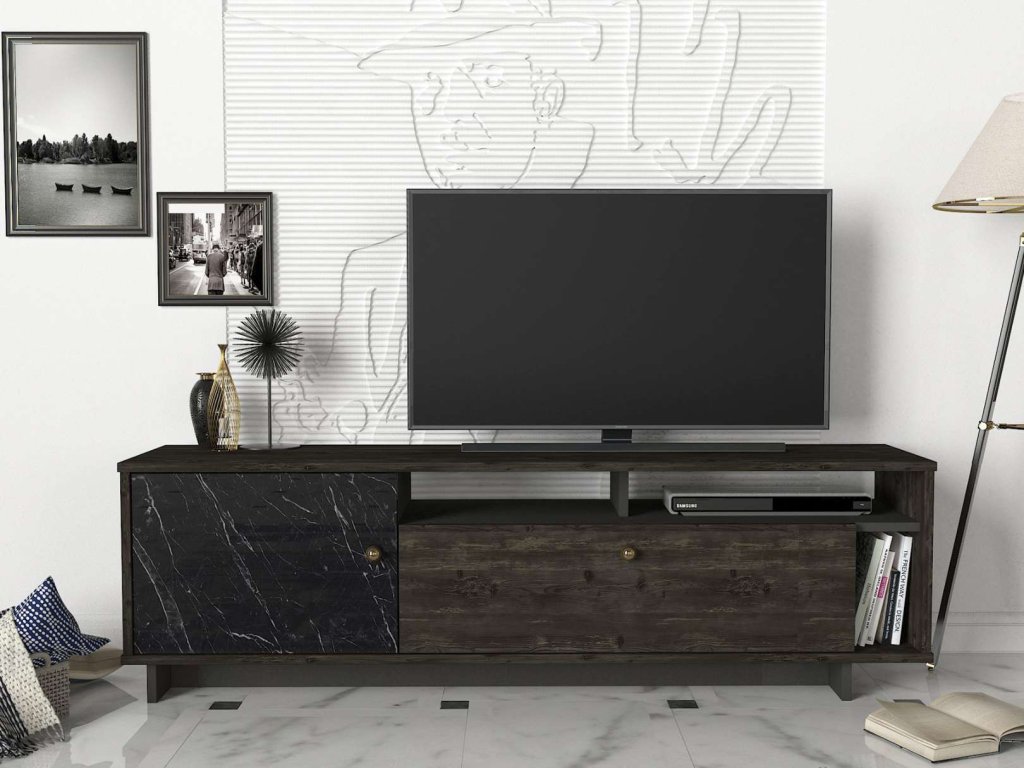 TV stolek TERMA je ideální volbou pro ty, kteří hledají luxusní a funkční nábytek s elegantním vzhledem. Jeho kombinace tmavě hnědé a mramorové barvy a minimalistický design přinášejí do vašeho domova svěžest a moderní styl, zatímco poskytují dostatek úložného prostoru pro všechny vaše potřeby.