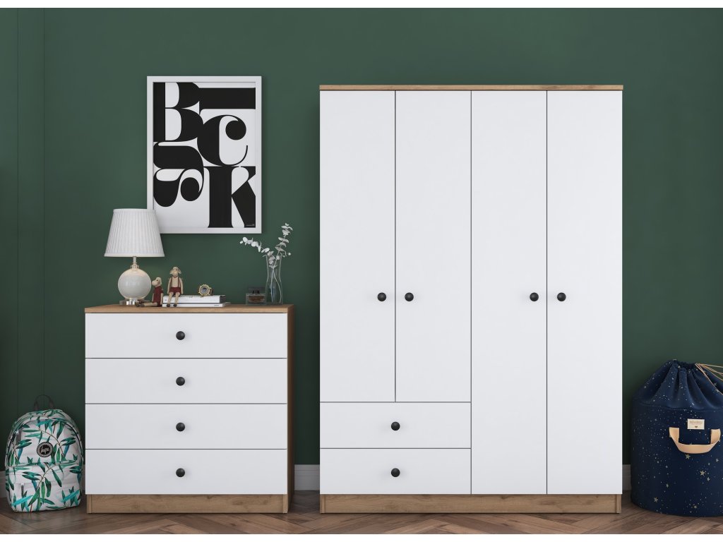 Sestava TERNO poskytuje vše, co potřebujete pro organizaci a pohodlí ve své ložnici. Šatní skříň zajišťuje dostatek úložného prostoru pro oblečení, šuplíková komoda je ideální na doplňky a ložní prádlo, zatímco psací stůl přináší praktické řešení pro pracovní či studijní činnosti.