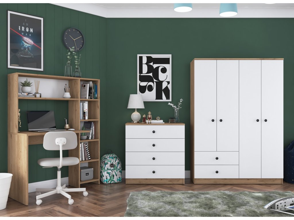 | Sestava obsahuje: | šatní skříň, šuplíková komoda, psací stůl |