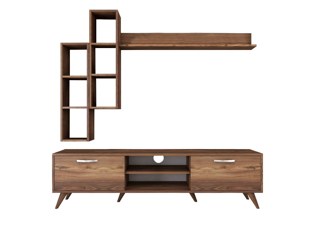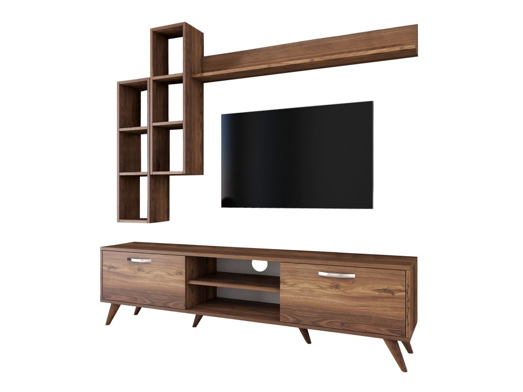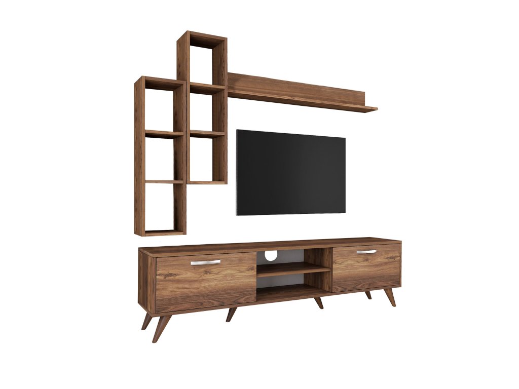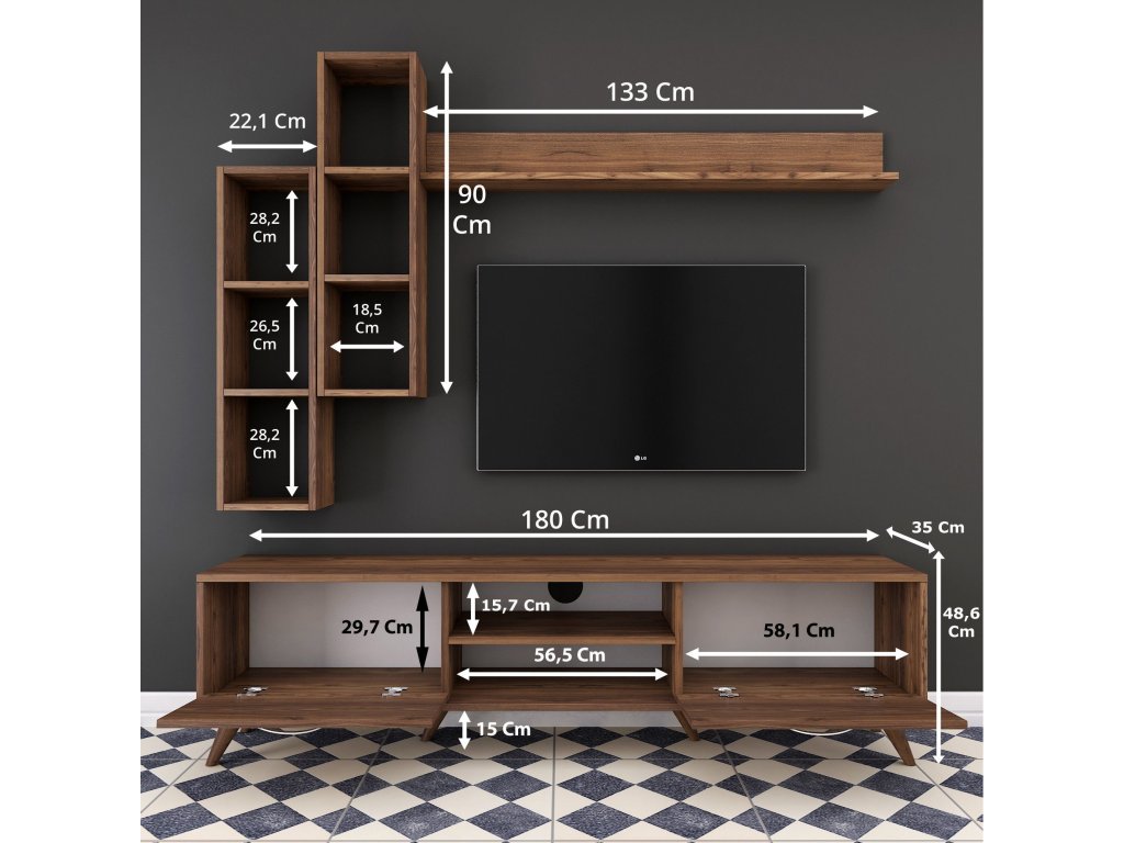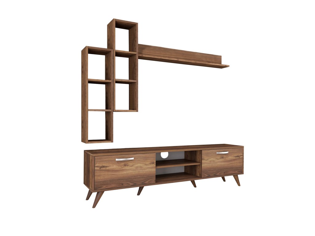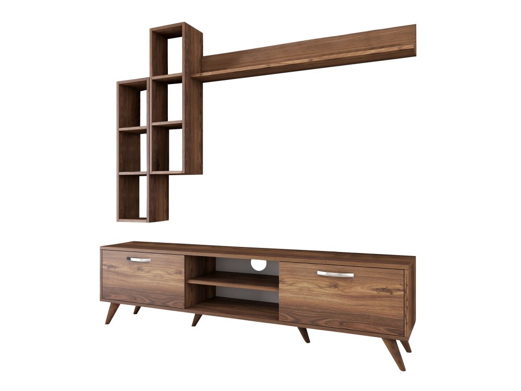 | Sestava obsahuje: | TV stolek 180x35x48,6cm, 2x nástěnný regál 22,1x18,5x90cm, nástěnná police133x15x15cm |