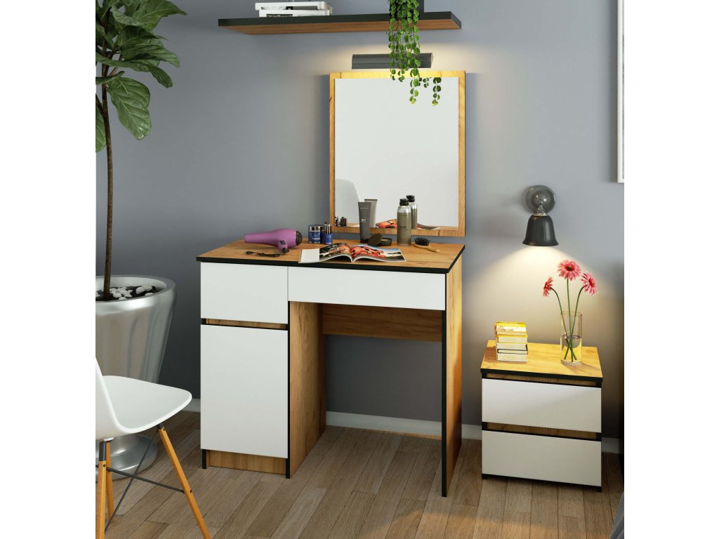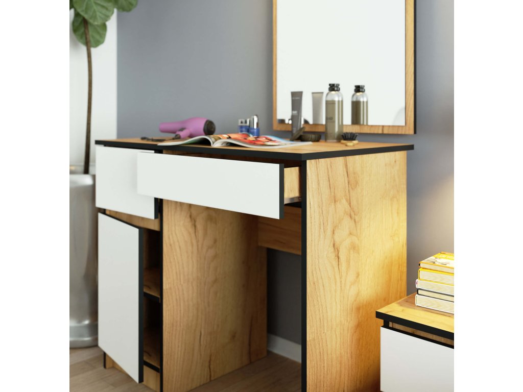PAVEL500L je designový toaletní stolek, který kromě svého krásného vzhledu nabízí také spoustu úložného prostoru díky dvěma zásuvkám a skříňce s plnými dvířky. Integrované zrcadlo je ideální pro vaše ranní a večerní rutiny, zatímco dvě poličky poskytují další možnosti uspořádání.