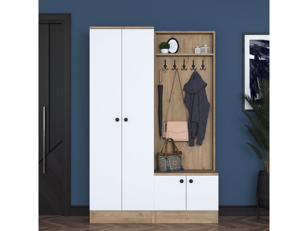 Předsíňová sestava TOMATO je navržena tak, aby spojovala moderní styl s praktickým využitím prostoru. Kombinace bílé barvy a dekoru ořechu přidává do předsíně svěžest a eleganci, zatímco její uspořádání pomáhá udržet vše přehledné a organizované.