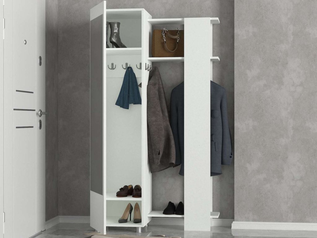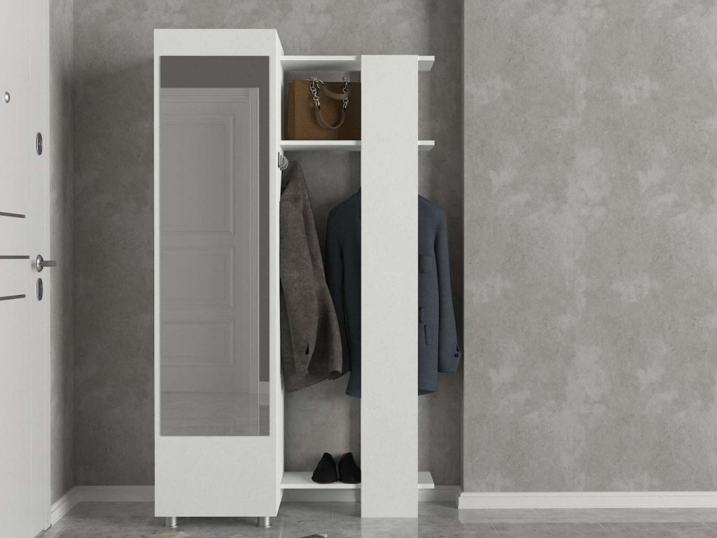 Předsíňová sestava TRANE nabízí kombinaci věšáků, zrcadla, skříně a šatníku, což zajišťuje dostatek úložného prostoru pro všechny vaše potřeby. Vyrobena z kvalitních materiálů LTD a skla s tloušťkou 18 mm, zaručuje dlouhou životnost a odolnost. Její čistý bílý design dodává sestavě moderní a svěží vzhled, který snadno zapadne do každého interiéru.