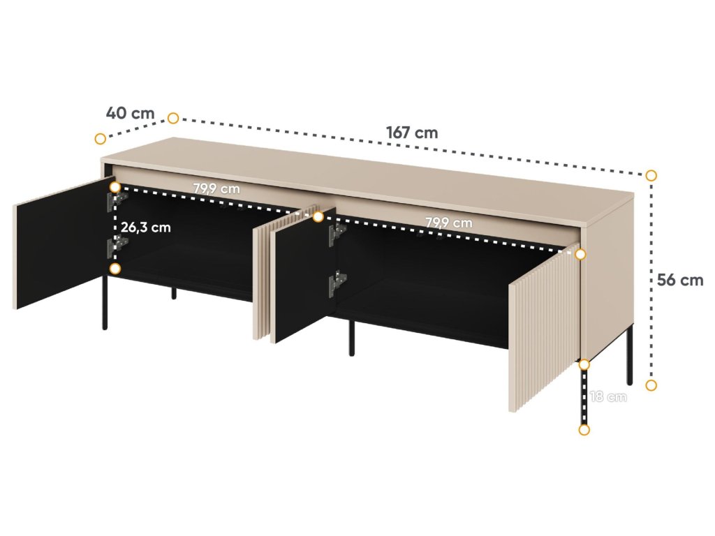 přední strana MDF 18 mm s půlválcovým frézováním, vše hraněno ABS páskou 1 mm,
