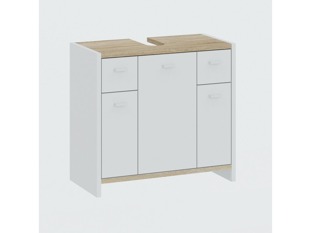 Koupelnová skříňka TREO nabízí moderní design v bílém matném provedení v kombinaci s barvou dubu. Nabízí bohatý úložný prostor díky dvěma zásuvkám a třem přihrádkám.