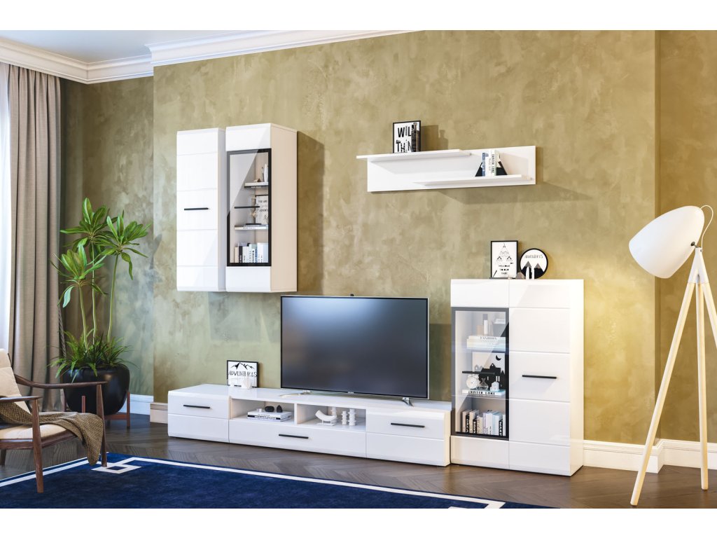 - Úložný prostor: TV stolek, police, závěsné skříňky, komoda se sklem