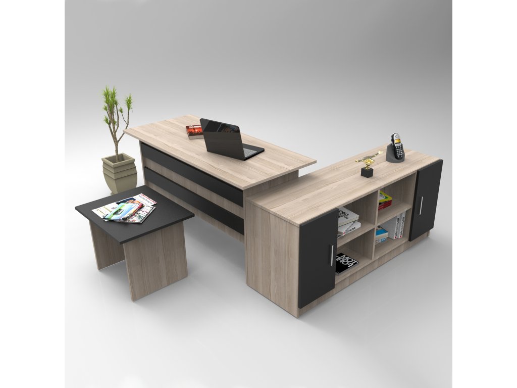 Kancelářský set VARIO 10 je navržen tak, aby splňoval potřeby moderních pracovních prostorů. Tato praktická sestava obsahuje psací stůl, konferenční stolek a prostornou komodu, které společně vytvářejí harmonický a elegantní celek. Vysoce kvalitní zpracování z LTD materiálu a elegantní kombinace barev Baroko + antracit dělají z tohoto setu ideální volbu pro vaši pracovnu.