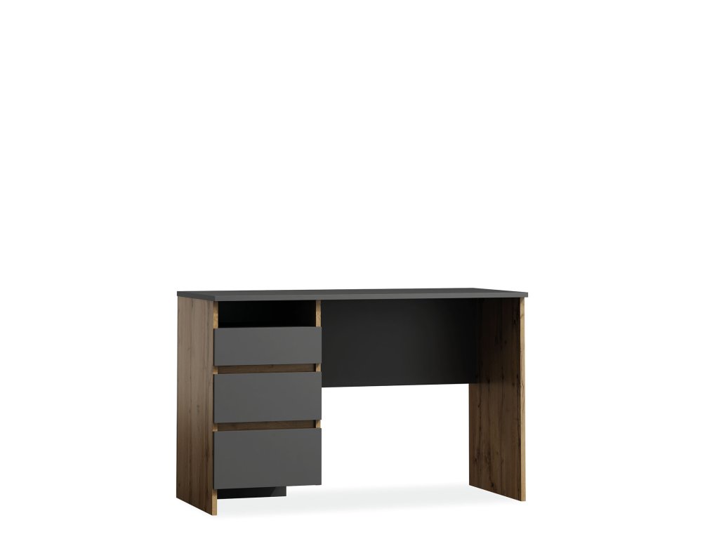 Psací stolek je v jednoduchém provedení. Je vhodný do dětského pokoje či pracovny. Disponuje třemi praktickými zásuvkami. Stolek je vyroben z kvalitních LTD desek, které se snadno udržují. Barevné provedení stolku je v kombinaci antracit a dub Wotan. Rozměry (š,v,h): 120 x 77 x 55 cm. Dodáváme v demontovaném stavu.Doplňkové parametry