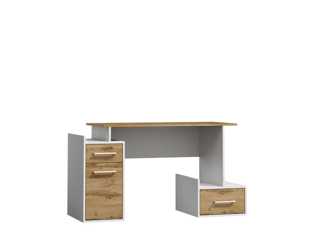 Psací stolek je v moderním provedení. Je vhodný do dětského pokoje či pracovny. Stolek je vyroben z kvalitních LTD desek, které se snadno udržují. Disponuje praktickými zásuvkami. Je jednodveřový. Barevné provedení stolku je v kombinaci barev dub Wotan a bílá. Rozměry (š,v,h): 170 x 78 x 60 cm. Dodáváme v demontovaném stavu.Doplňkové parametry