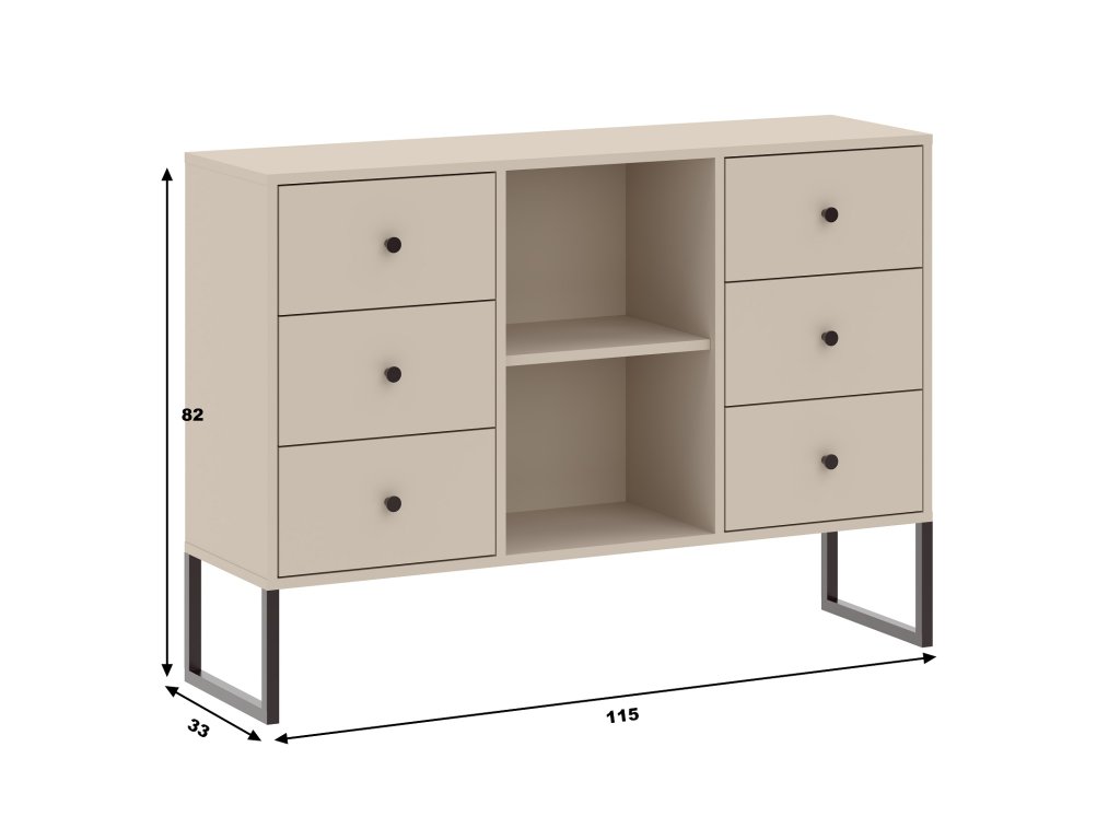Komoda je vyrobena z kvalitních LTD desek. Jsou nenáročné na údržbu. Konstrukce kovová, v černém provedení. Komoda disponuje třemi praktickými šuplíky. Komoda disponuje šesti praktickými šuplíky a jednou policí.
