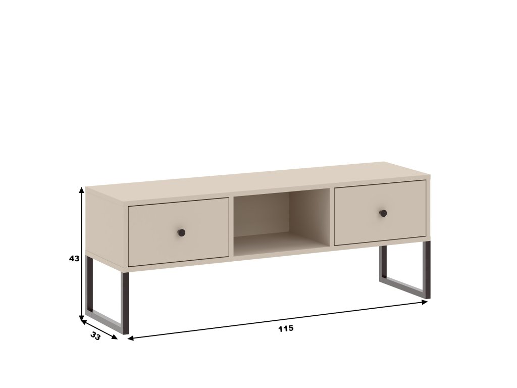 Televizní stolek je vyroben z kvalitních LTD desek. Jsou nenáročné na údržbu. Konstrukce kovová, v černém provedení. Televizní stolek disponuje dvěma zásuvkami.