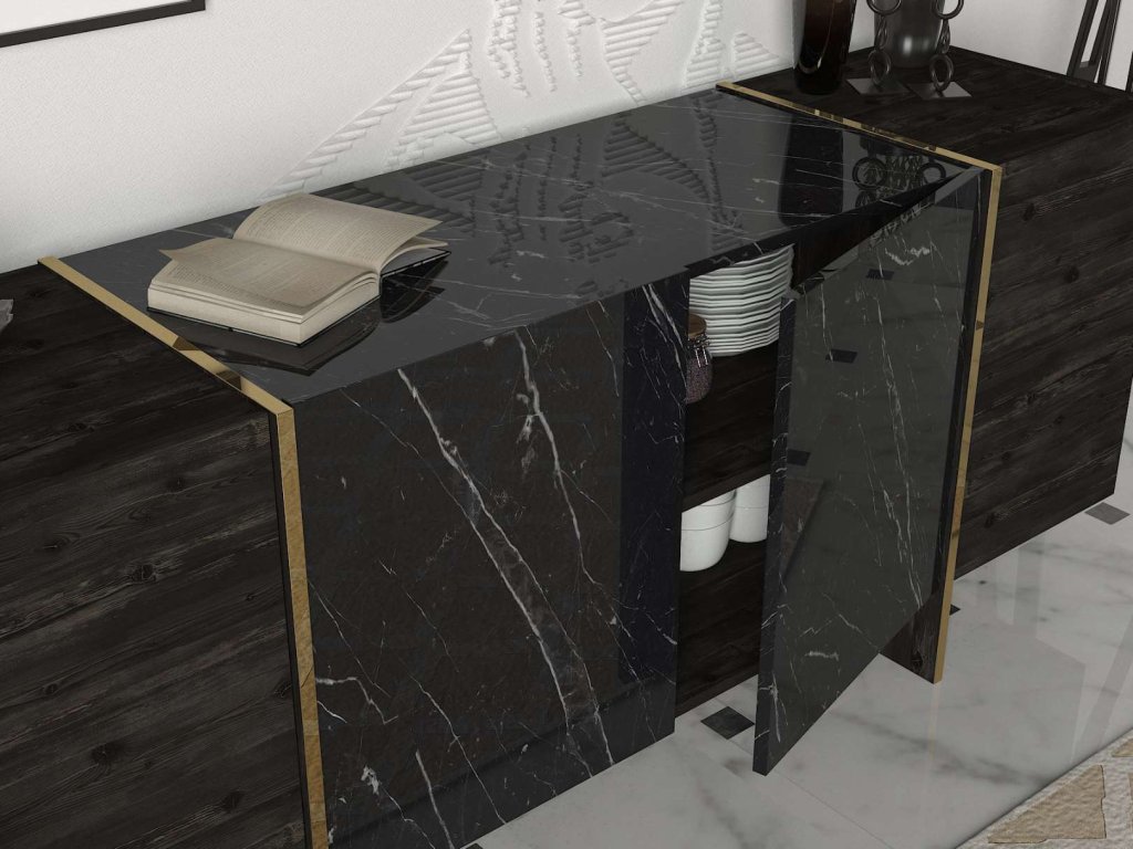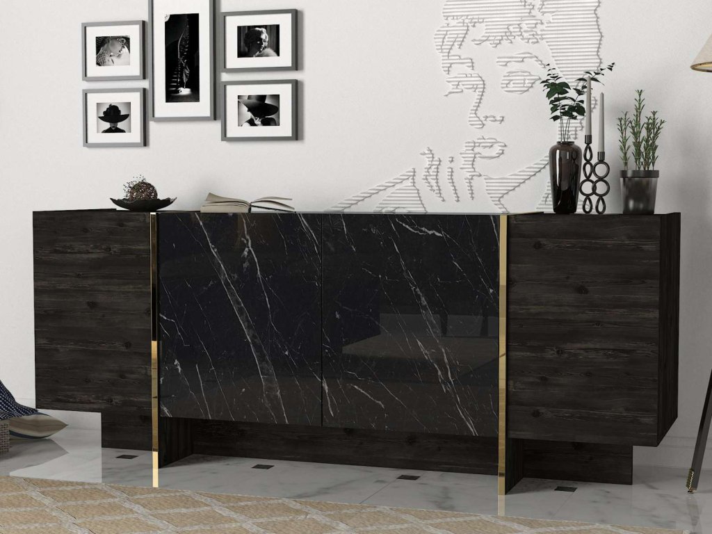 Komoda VERONA je vyrobena z kvalitního LTD materiálu s tloušťkou 18 mm, což zajišťuje její pevnost a dlouhou životnost. Elegantní kombinace tmavě hnědé barvy a mramorového dekoru dodává komodě luxusní a sofistikovaný vzhled, který se hodí do jakéhokoliv interiéru. Komoda je vybavena čtyřmi dvířky, které poskytují dostatek úložného prostoru pro vaše potřeby.