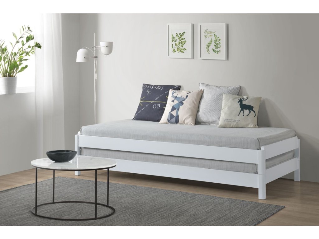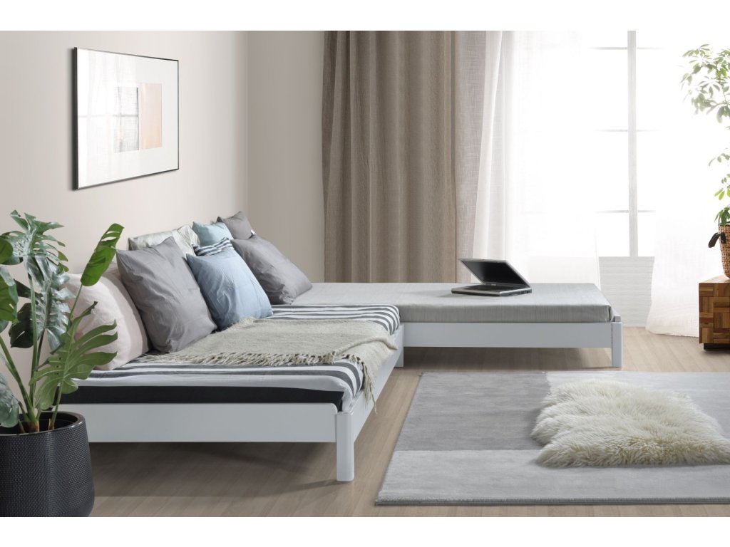 Pevná bílá dřevěná postel PUZZLE ideální pro hosty. Minimalistický design vhodný do každého interiéru ložnice, pro dospělé i děti. Multifunkční design 3v1. Postel pro hosty, která šetří místo – Postel pro hosty je díky svému designu perfektním řešením šetřícím prostor, které musíte mít, když hostíte hosty.