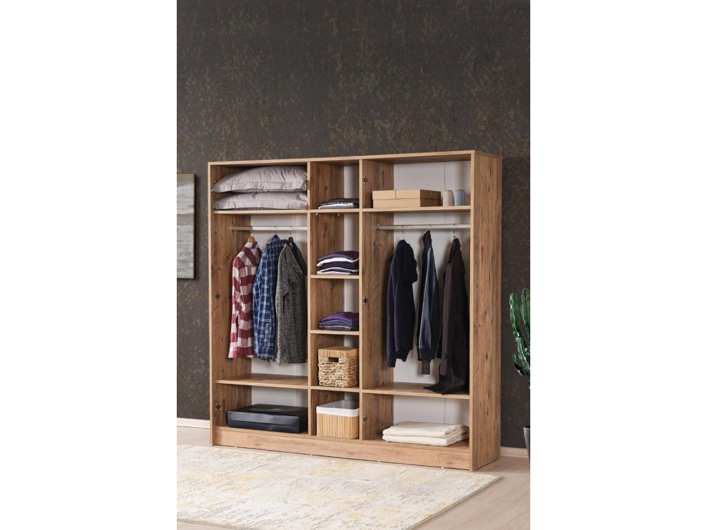 Šatní skříň nabízí prostorné otevírací dveře, které usnadňují přístup ke všem vašim věcem. Vyrobena z kvalitní dřevotřísky, zaručuje dlouhou životnost a snadnou údržbu.