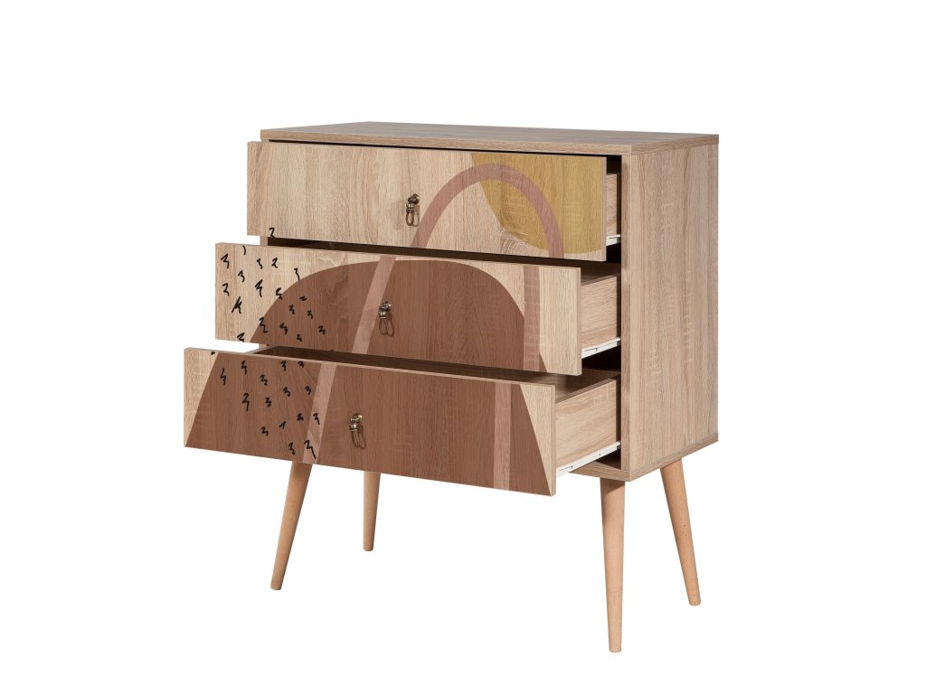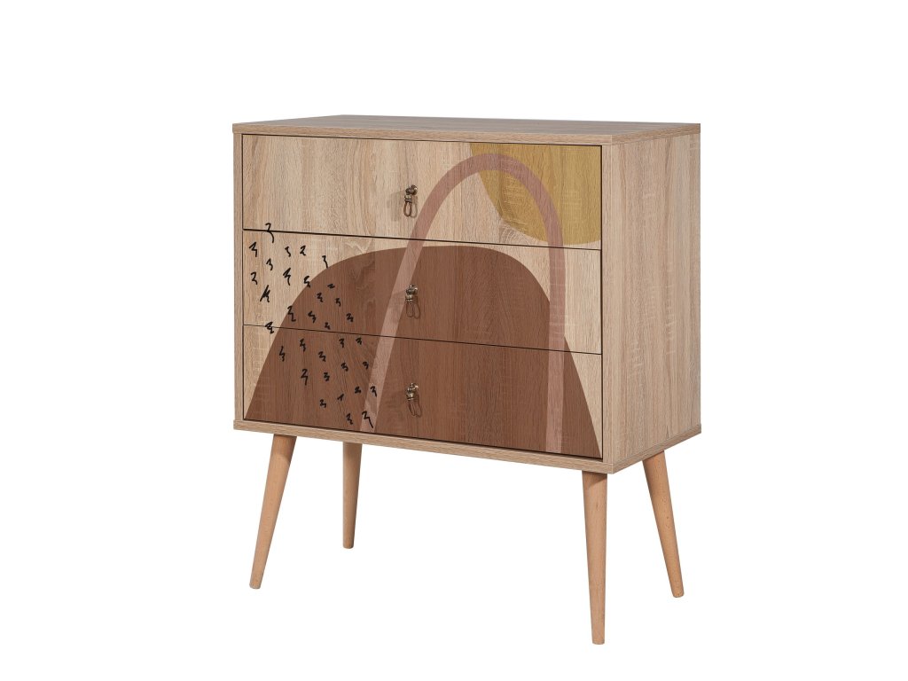 VILLAGE nabízí nejen stylový design, ale také praktické řešení pro uložení vašich věcí. 3 zásuvky poskytují dostatek úložného prostoru, zatímco kvalitní materiály zajišťují odolnost a dlouhou životnost nábytku. Unikátní kombinace melaminu, laminátu a masivu spolu s luxusním provedením dělají z této komody nepostradatelný doplněk do každého moderního interiéru.
