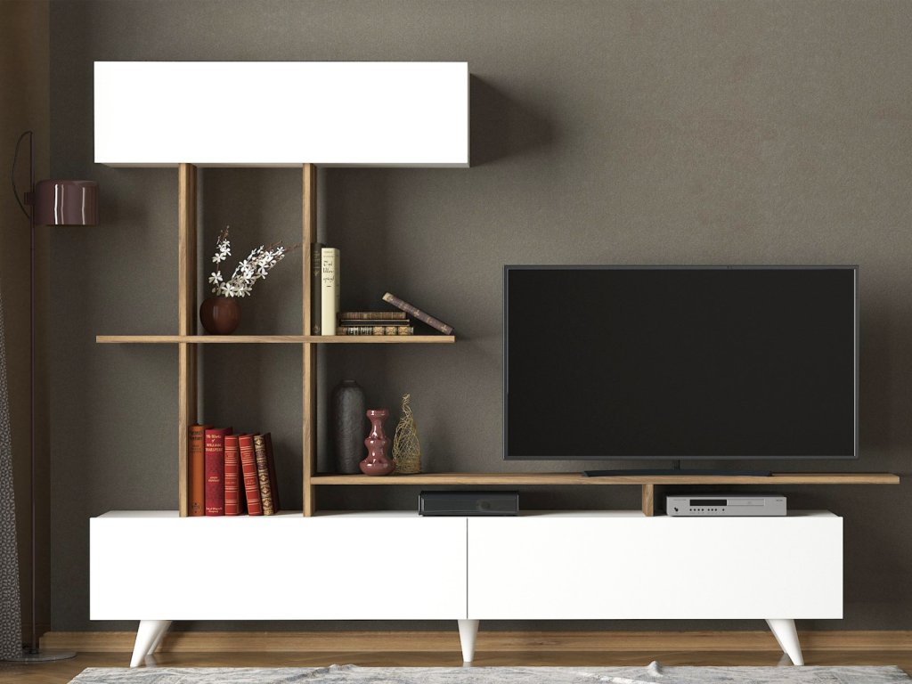 Jednoduchá a malá obývací stěna VIOLA je v moderním bílém provedení v kombinaci s přírodní barvou ořechu v zajímavém designu. Díky svým rozměrům se skvěle hodí do malých interiérů. TV stěna obsahuje praktické otevřené police v podobě regálu, které výborně poslouží k odložení knih či dekorací a také tři uzavřené skříňky s výklopnými dvířky, díky čemuž máte i přes malé rozměry dostatek úložného prostoru.