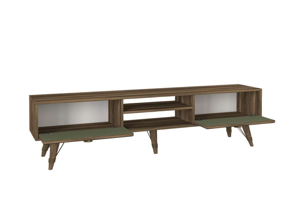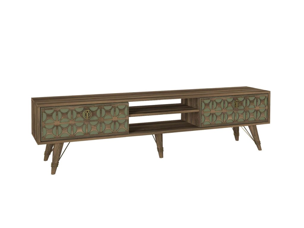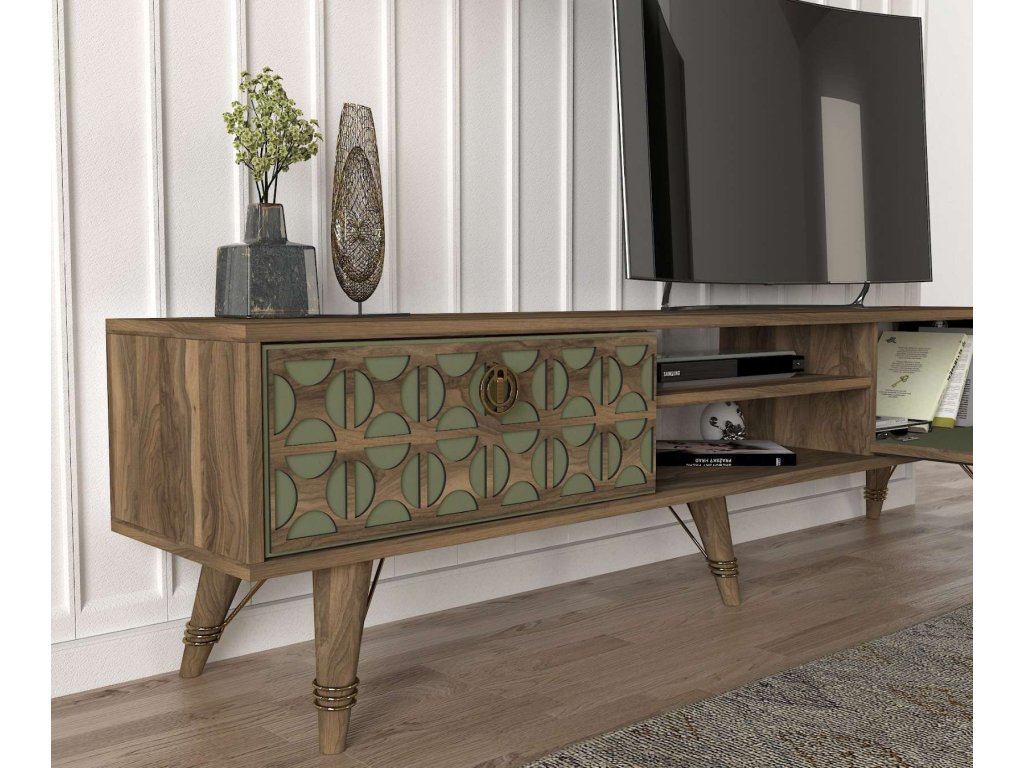 Představujeme VIOLE, TV stolek, který skvěle kombinuje funkčnost a orientální design. Tento kus nábytku s ořechovým a zeleným provedením přináší do vašeho obývacího pokoje teplý a přívětivý vzhled s nádechem exotiky.
