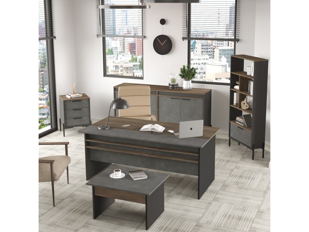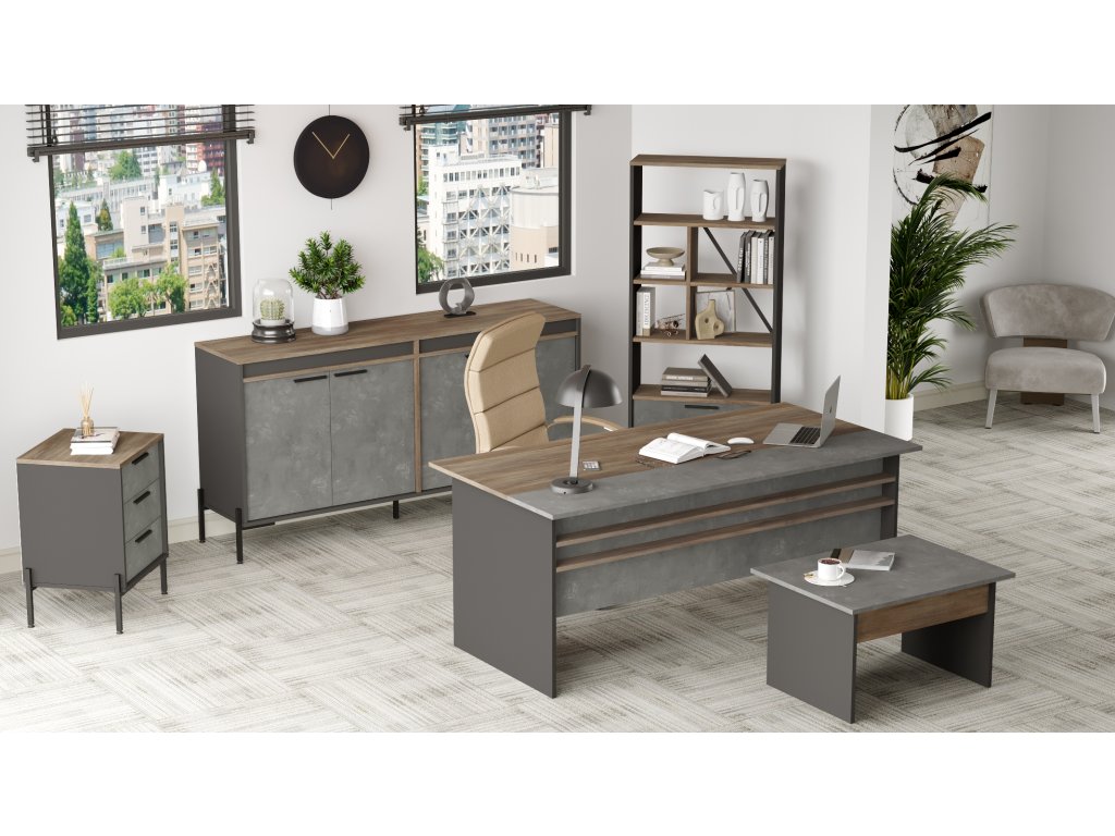 Kancelářský set VISTA 9 je ideálním řešením pro všechny, kdo hledají elegantní a funkční vybavení do pracovny. Tento set kombinuje kvalitní LTD materiál s moderním barevným provedením bavlna + beton + antracit, což přináší nejen estetiku, ale i dlouhou životnost. Sestava zahrnuje psací stůl, konferenční stolek, malou komodu, prostornou komodu a knihovnu, které poskytují dostatek prostoru pro efektivní práci i organizaci.