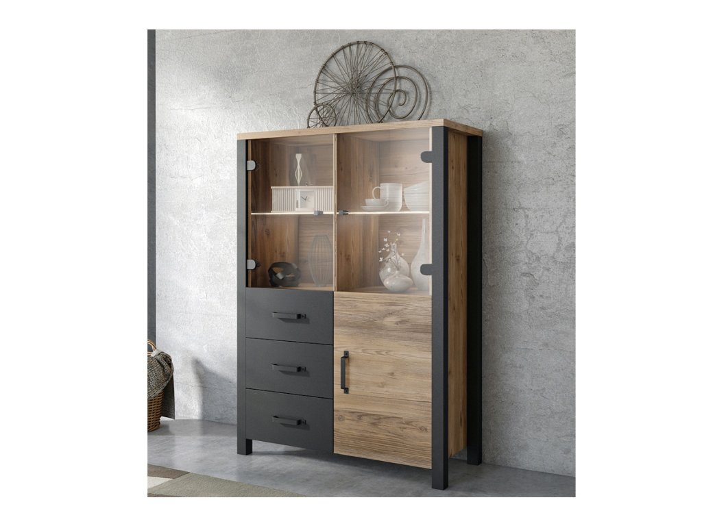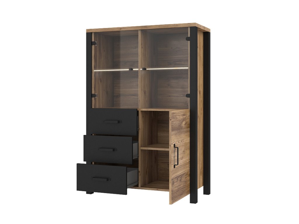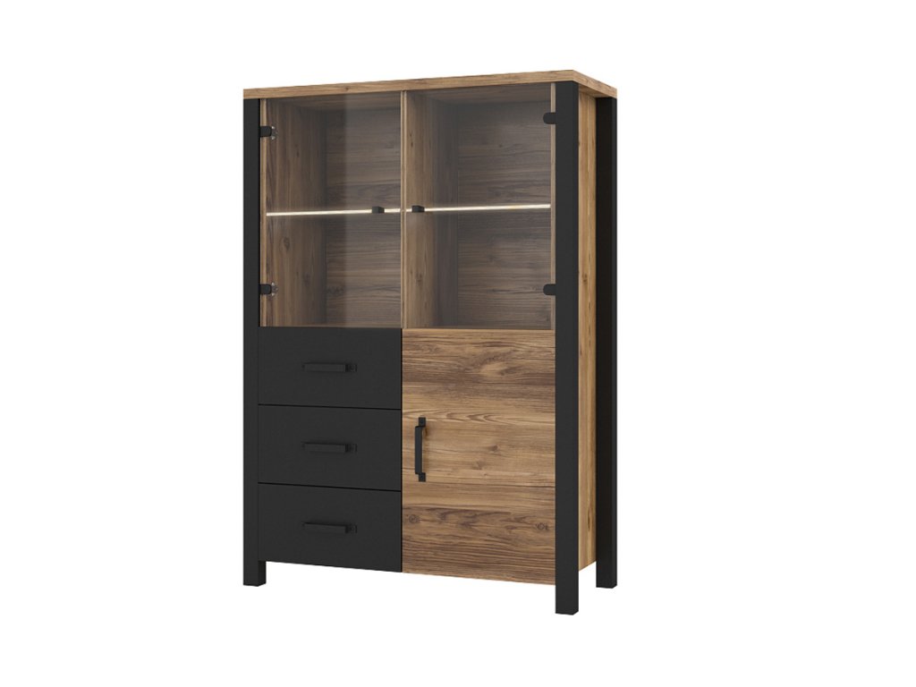 Vitrínu nabízíme v zajímavém barevném provedení smrk appenzeller/černý mat. Má elegantní úchytky černé barvy.