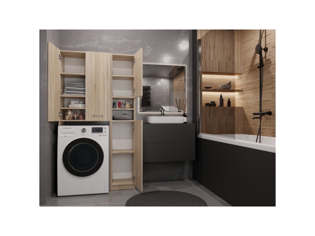 Rozměry 180 x 96 x 30 cm CLEVELAND DD poskytují dostatek prostoru pro všechny vaše potřeby. Skříňka nad pračku a vysoká skříňka nabízejí efektivní úložné řešení s celkem 7 policemi a dvěma dveřmi. Tato kombinace umožňuje snadné uspořádání všeho od koupelnových doplňků po ručníky.