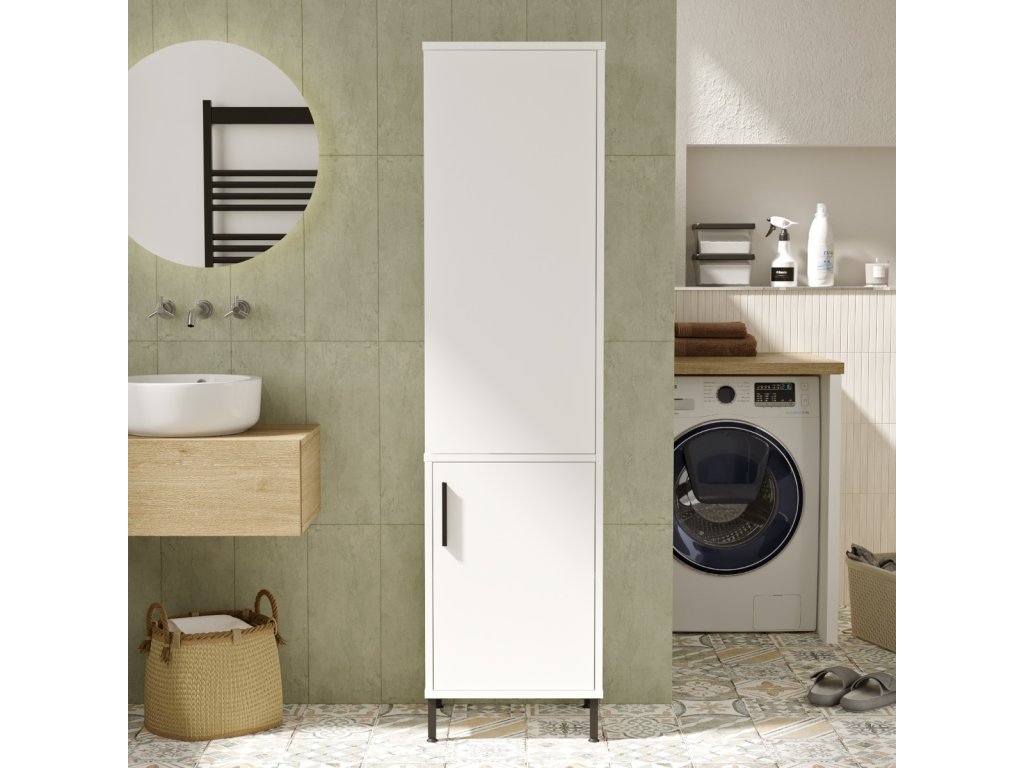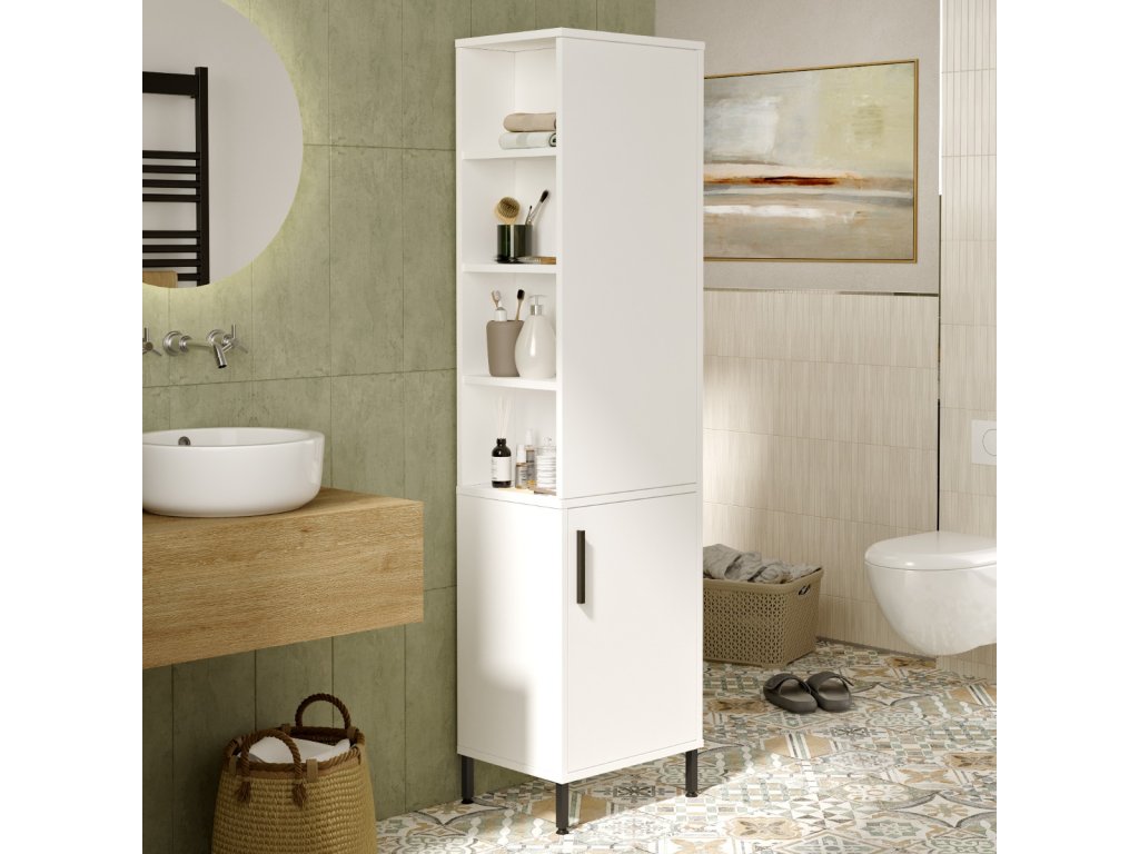 Oživte svou koupelnu policovou skříní VILLY 1, která kombinuje jednoduchost bílé barvy s kvalitou materiálů LTD a kovu. Tato vysoká skříň nejen skvěle vypadá, ale také nabízí štědrý úložný prostor, což z ní činí ideální doplněk do každé moderně zařízené koupelny.