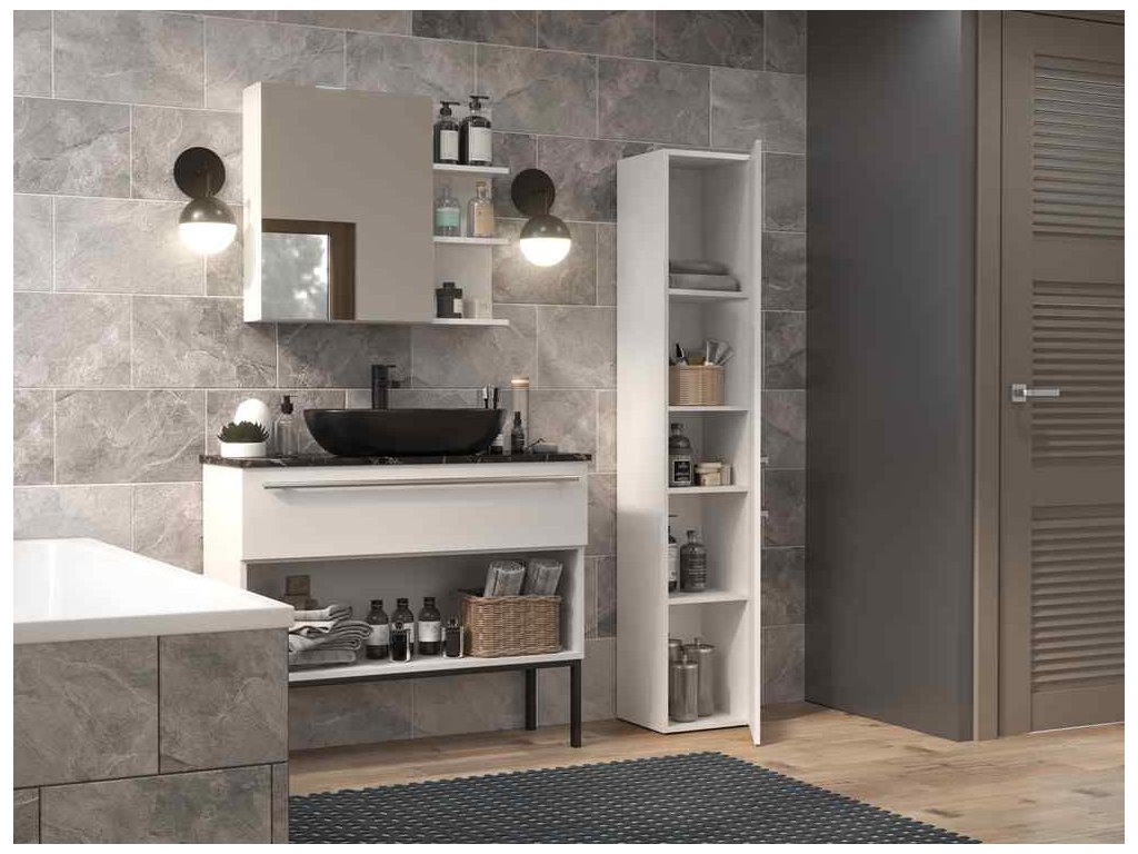 Seznamte se s NEL II, elegantní vysokou koupelnovou skříňkou, která přináší do vaší koupelny svěží a moderní vzhled. Tato skříňka, vyrobená z odolného materiálu LTD a dokončená v bílém lesklém dekoru, je ideální volbou pro ty, kteří hledají spojení funkčnosti a sofistikovaného designu.