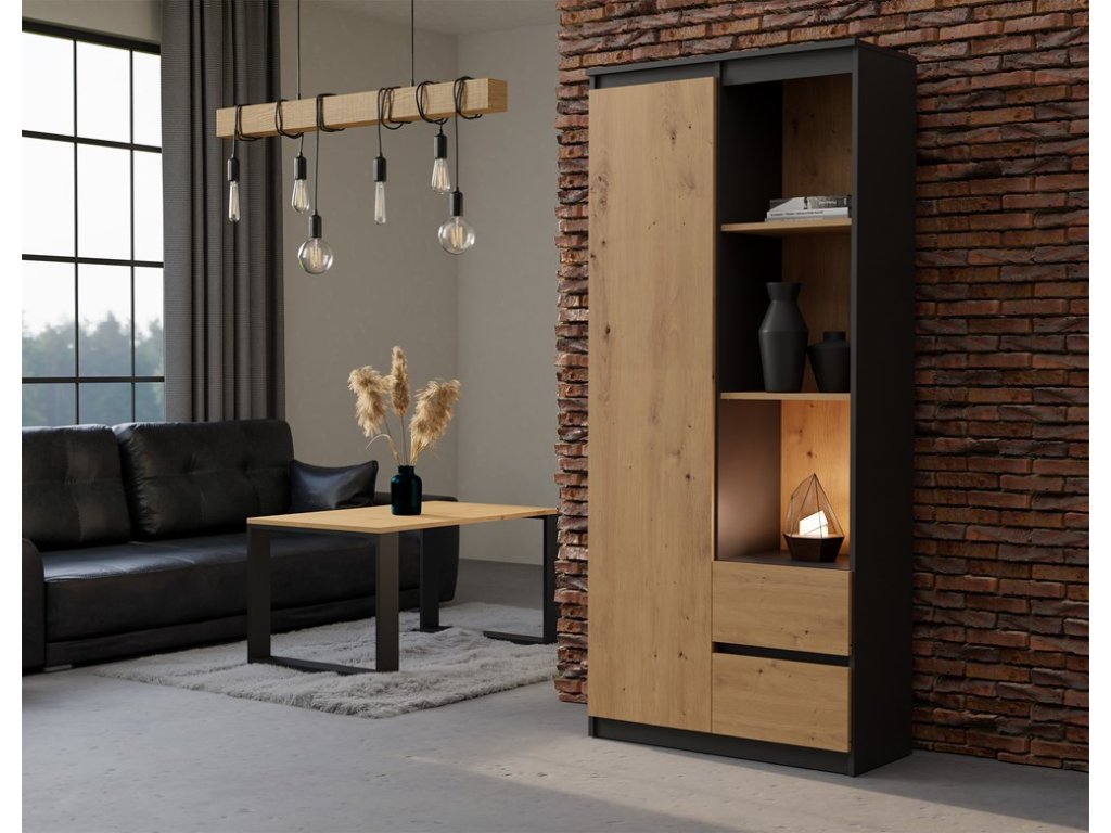 - Design: Vysoká skříň s atraktivní kombinací antracitové barvy a dubu Artisan