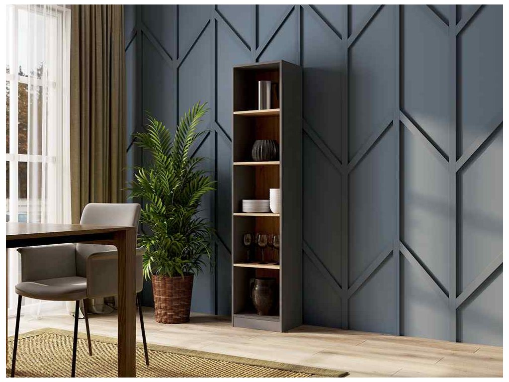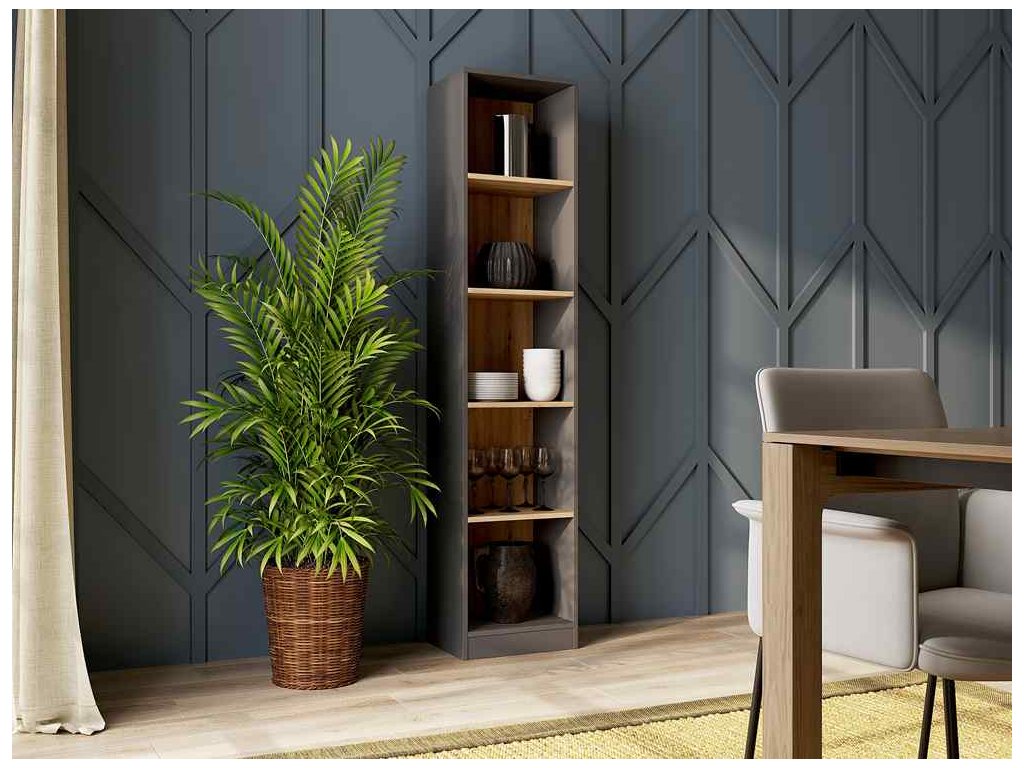 Unikátní kombinace antracitové barvy a odstínu dubu Artisan dodává regálu sofistikovaný a teplý vzhled, který se snadno začlení do různých designů interiéru.