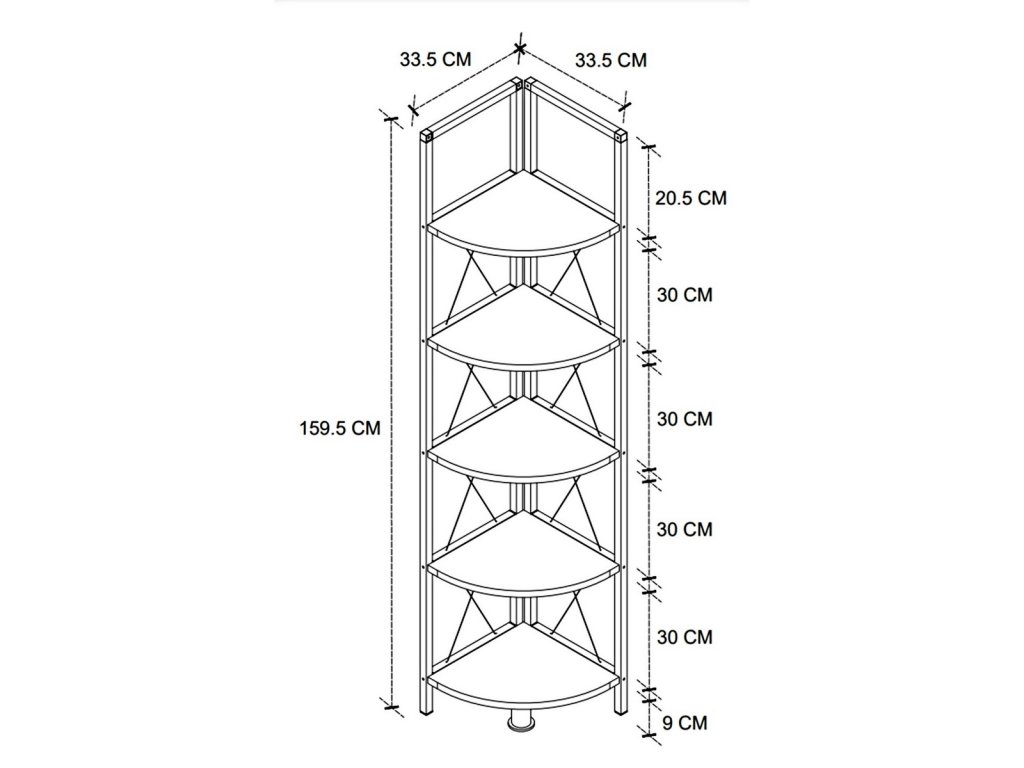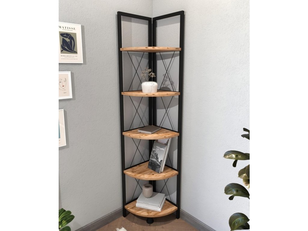 Rohový regál / knihovna je vyroben z kvalitní LTD desky, která je nenáročná na údržbu. Barva: borovice. Tloušťka desky - 18 mm. Konstrukce je kovová v černé barvě - natřený elektrostatickou práškovou barvou odolnou vůči rzi a poškrábání.