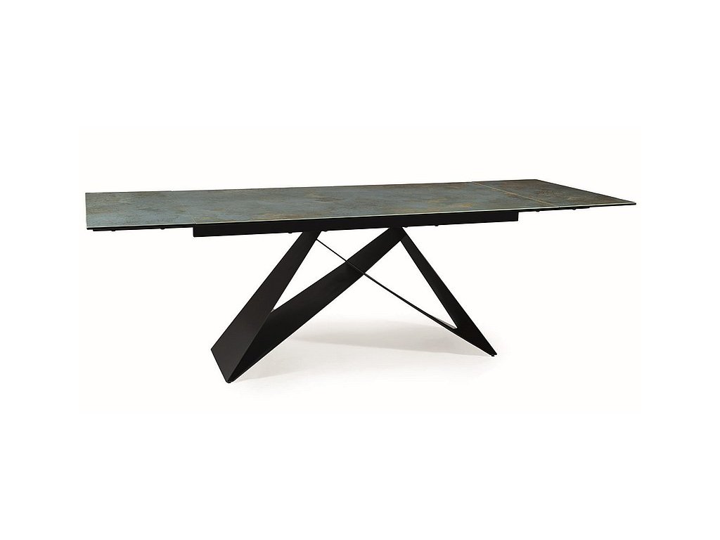 Konstrukce stolu je kovová černá v matné barvě, vrchní deska je vyrobena z tvrzeného skla + keramika v tyrkysové barvě.