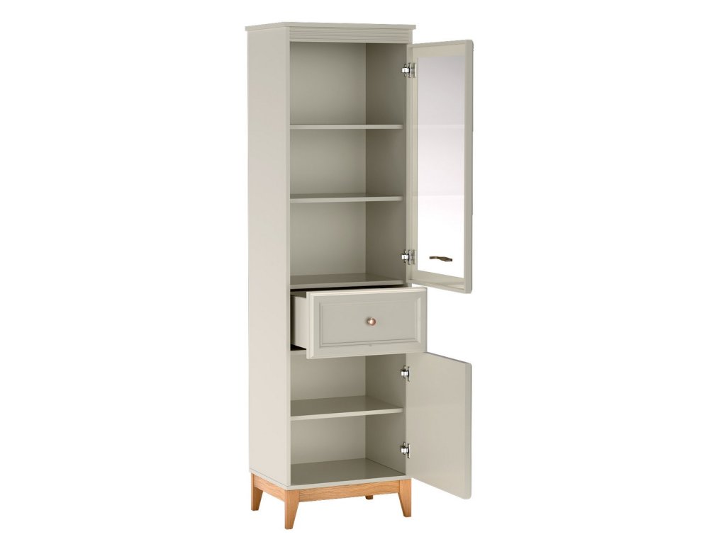 Vitrínu podepírají nožky z masivního dubového dřeva o výšce 15 cm, které jsou pevné a stabilní. Odolné laminované desky u korpusu a MDF deska u frontu (čela) nábytku s ABS hranami přispívají k dlouhé životnosti. Úchyty jsou kovové měděné barvy.
