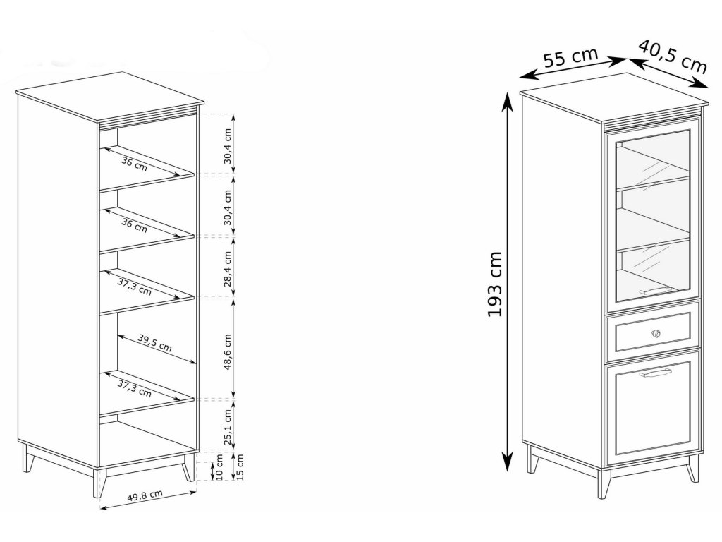 Díky jedné zásuvce a dvěma skříňkám (1 prosklené) s vnitřními policemi budete mít ve věcech konečně pořádek. Kvalitní výsuvy (soft close) a panty s tichým dovíráním se postarají o každodenní komfort. Rozměry viz obrázek.