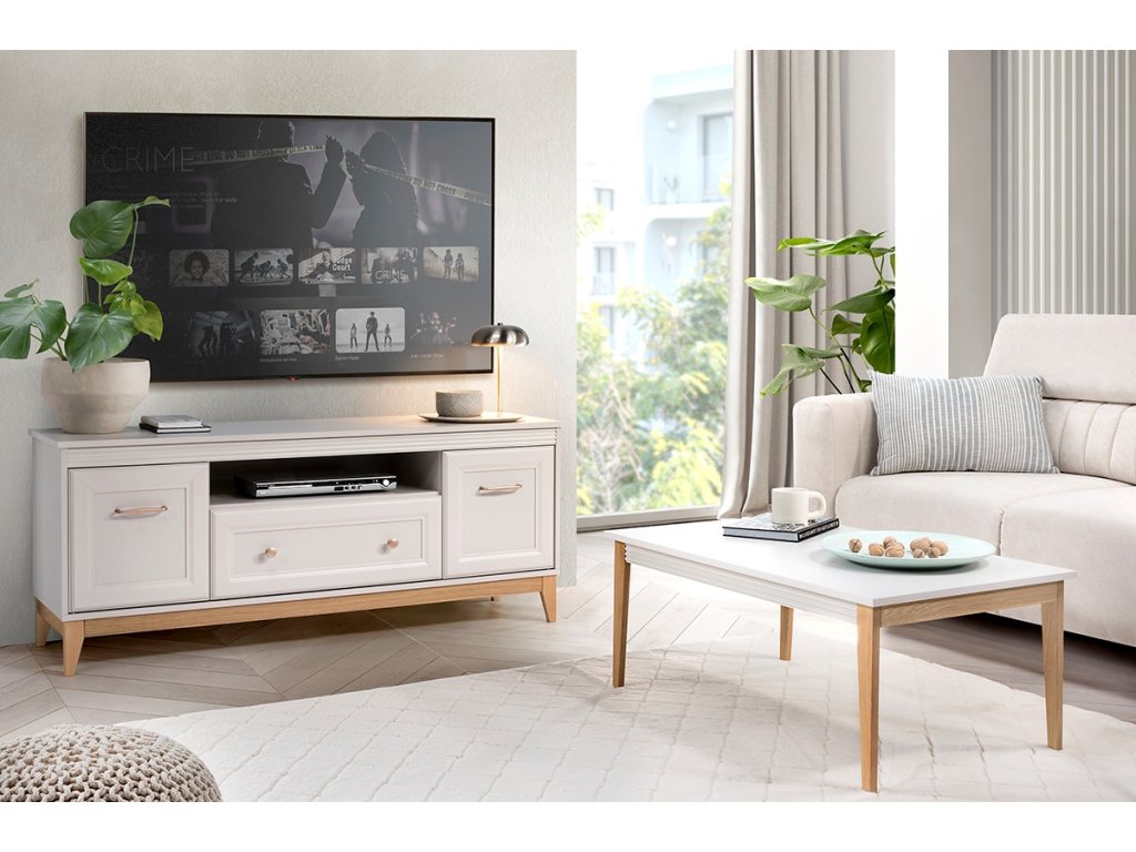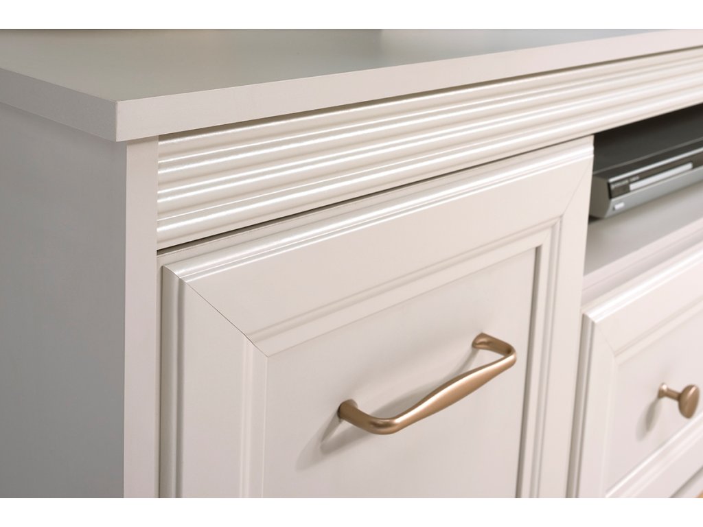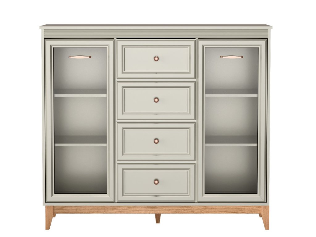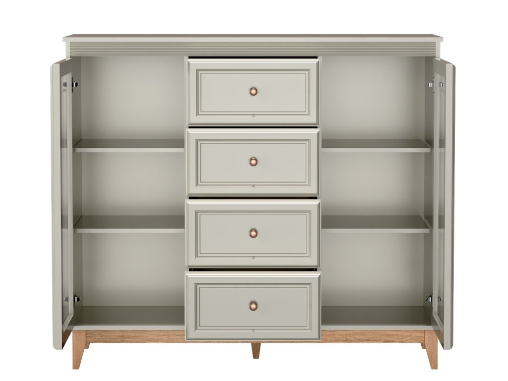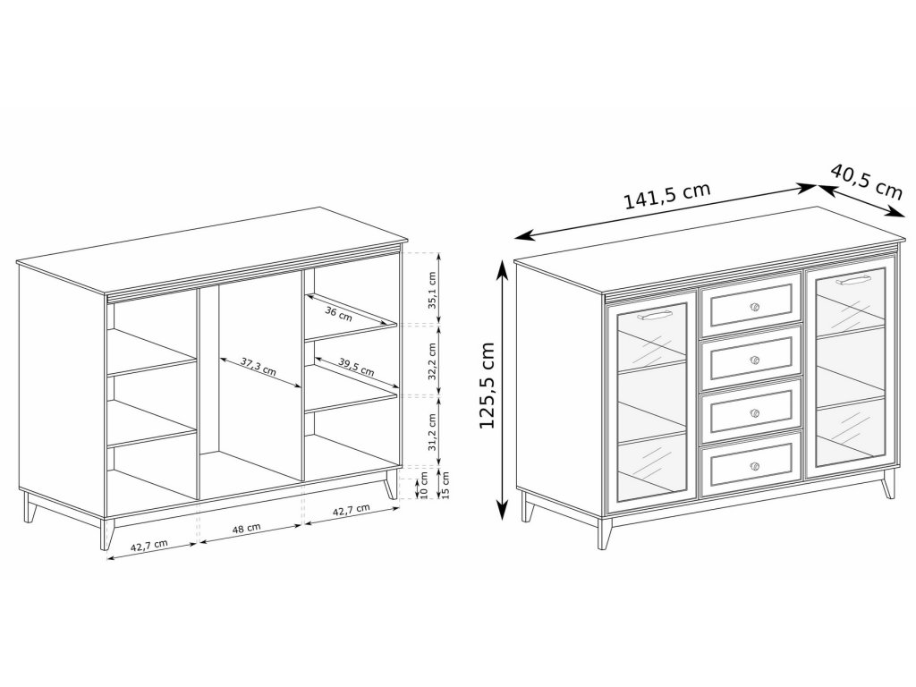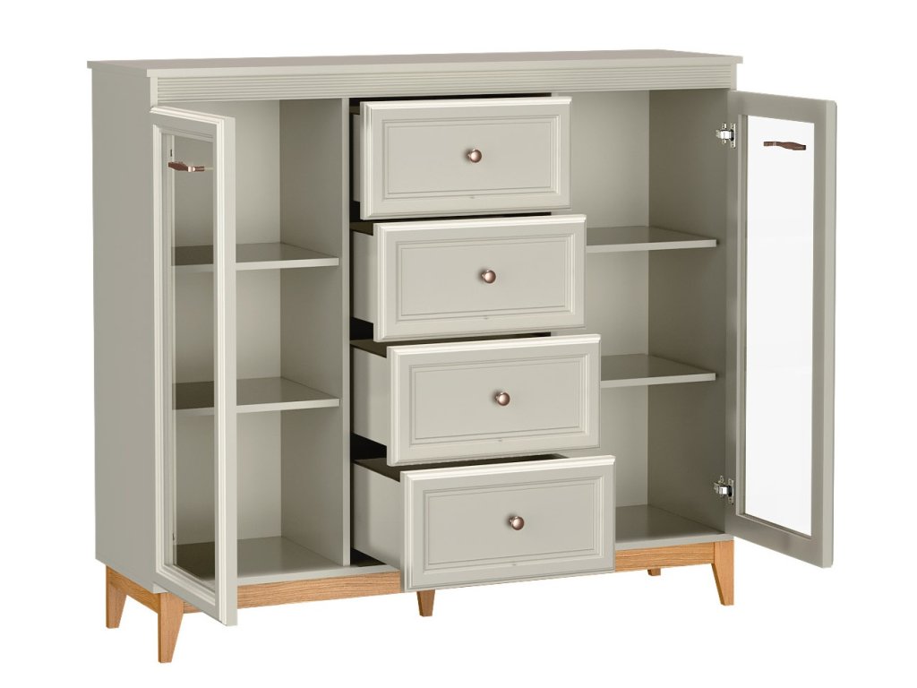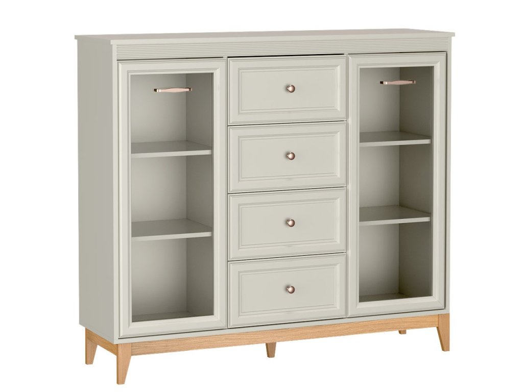 Díky čtyřem zásuvkám a dvěma proskleneným skříňkám s vnitřními policemi budete mít ve věcech konečně pořádek. Kvalitní výsuvy (soft close) a panty s tichým dovíráním se postarají o každodenní komfort. Rozměry viz obrázek.