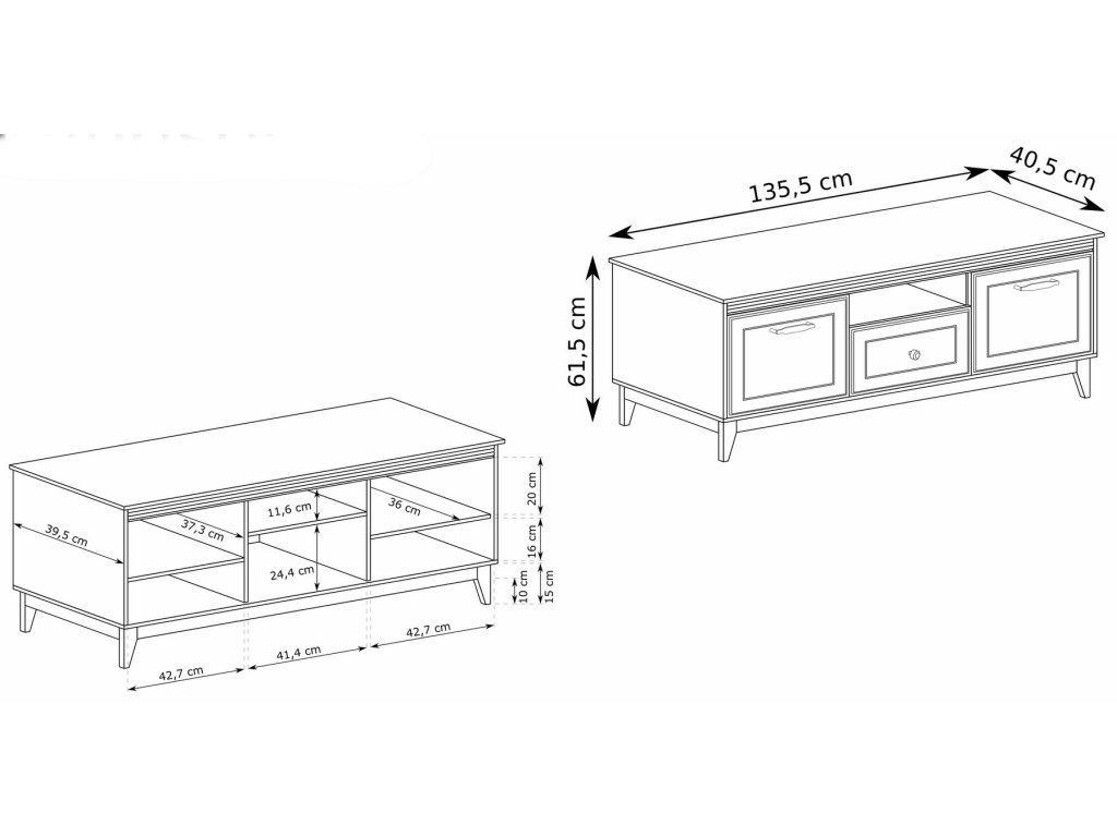 Díky jedné zásuvce a dvěma skříňkám s vnitřními policemi budete mít ve věcech konečně pořádek. Kvalitní výsuvy (soft close) a panty s tichým dovíráním se postarají o každodenní komfort. Rozměry viz obrázek.