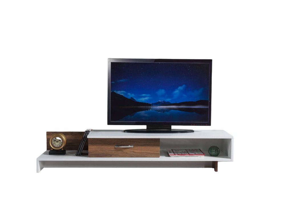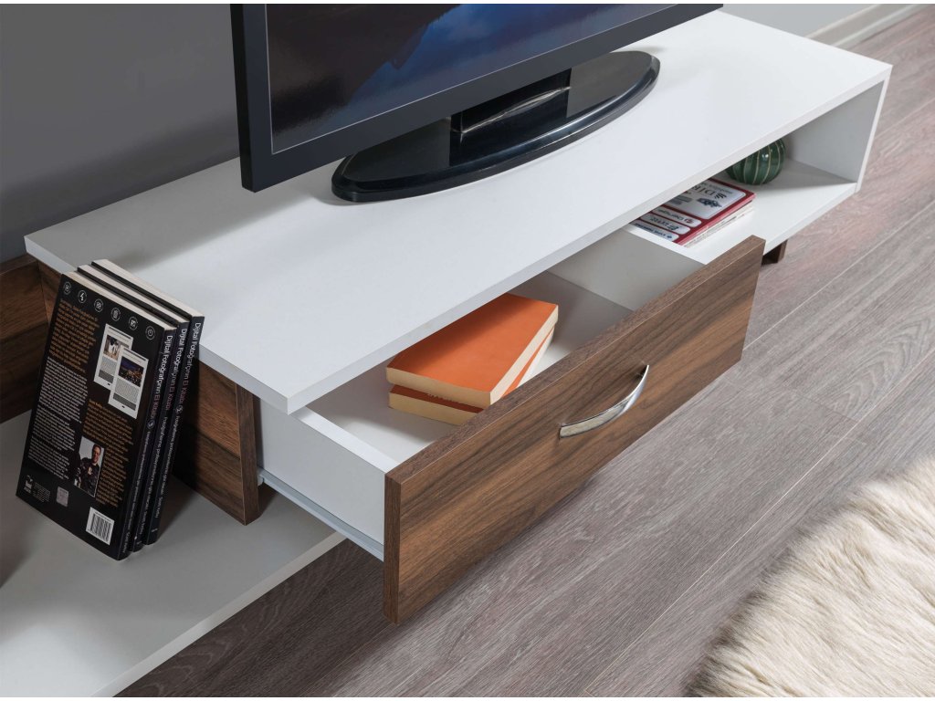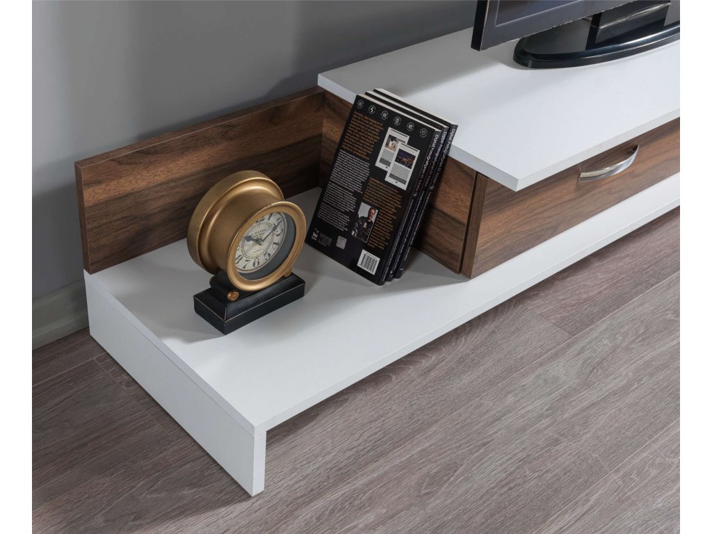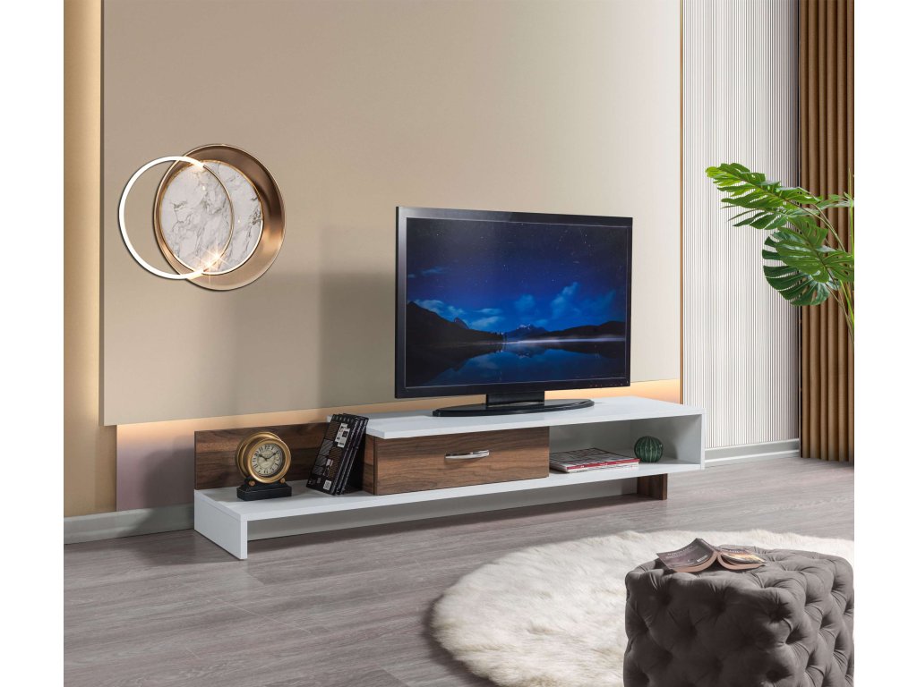 TV stolek WRAPS je ideální volbou pro ty, kteří hledají moderní a funkční nábytek s elegantním vzhledem. Jeho kombinace bílé a ořechové barvy a minimalistický design přinášejí do vašeho domova svěžest a moderní styl, zatímco poskytují dostatek úložného prostoru pro všechny vaše potřeby.