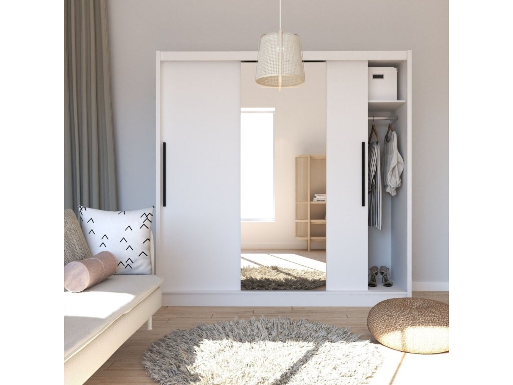 Šatní skříň je vyrobena z kvalitních LTD desek, které nenáročné na údržbu. Šatní skříň je třídveřová, Na středních dveřích má zrkladlo. Uvnitř jsou police a 2 šatní tyče.