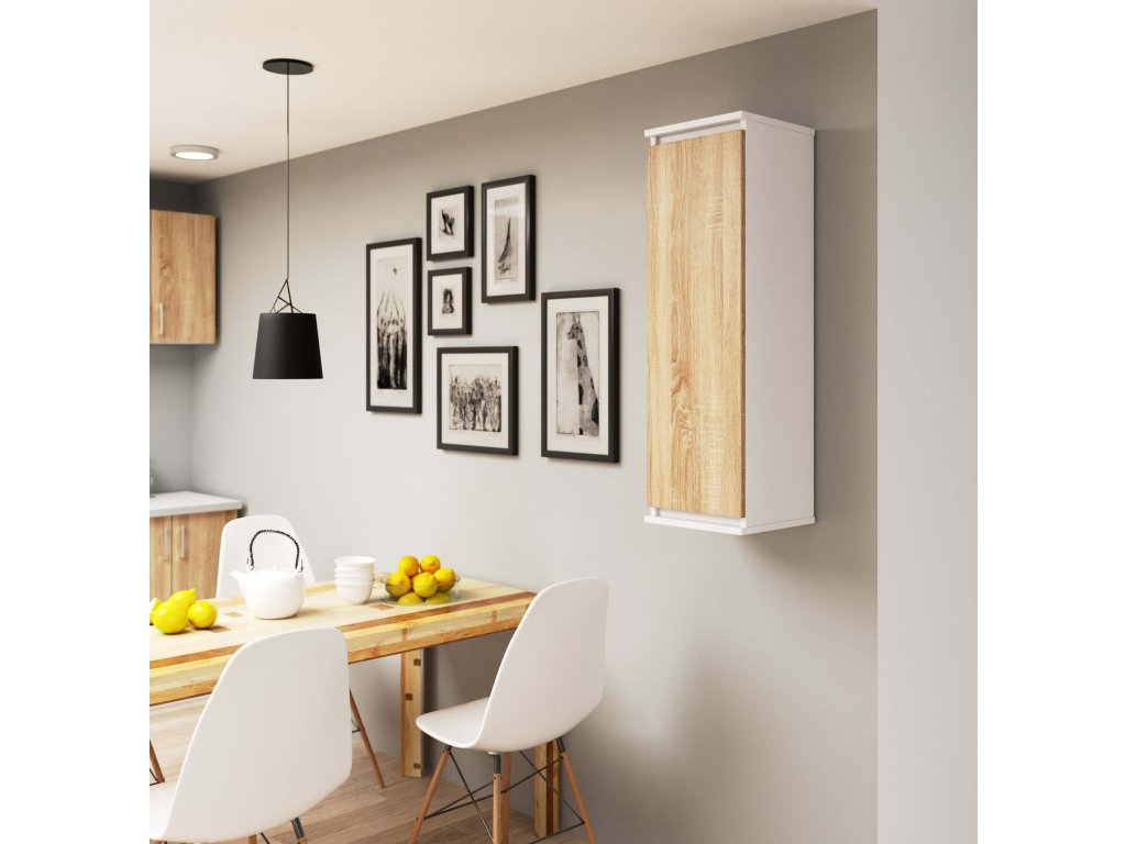 Odvážný design s kombinací bílé a dubu Sonoma dodá interiéru osobitost a jedinečnost. Díky materiálu LTD je závěsná skříňka odolná a vydrží vám léta v perfektním stavu. Tři prostorem police nabízí dostatek místa pro uskladnění vašich nejdražších dekorací, knih či trofejí. CLAINA30 - když chcete spojit styl a praktičnost.