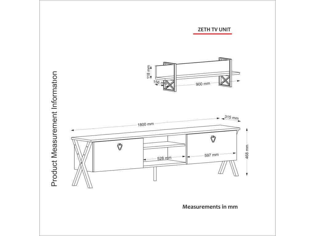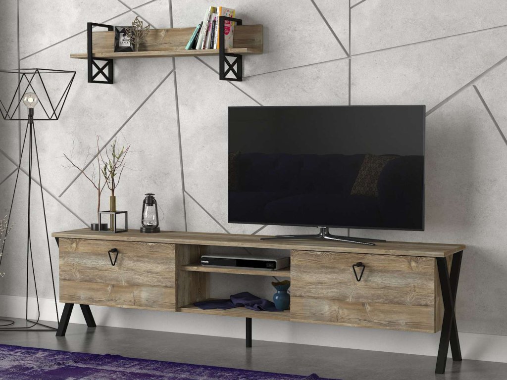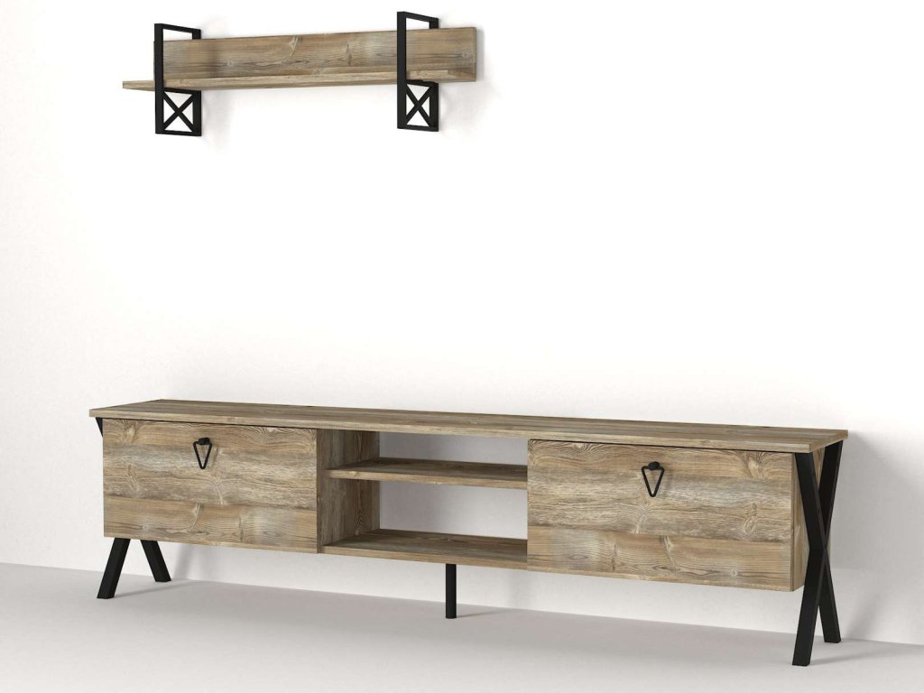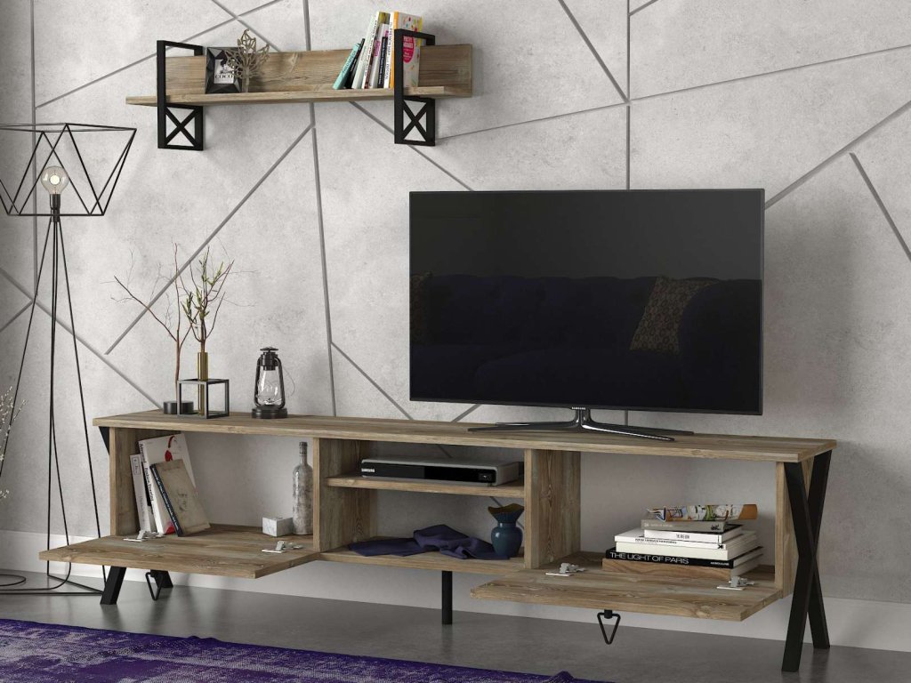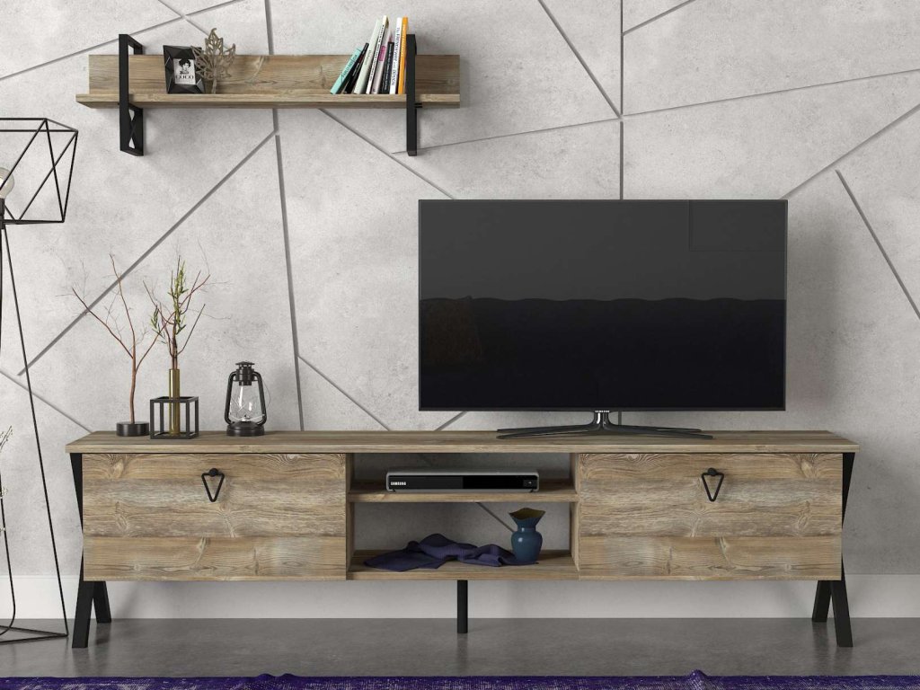 - Rozměry: TV stolek (180 x 32 x 47 cm) a nástěnné police (90 x 16 x 12 cm), což poskytuje efektivní a estetické řešení pro umístění televize a zobrazení drobných dekorací nebo knih.