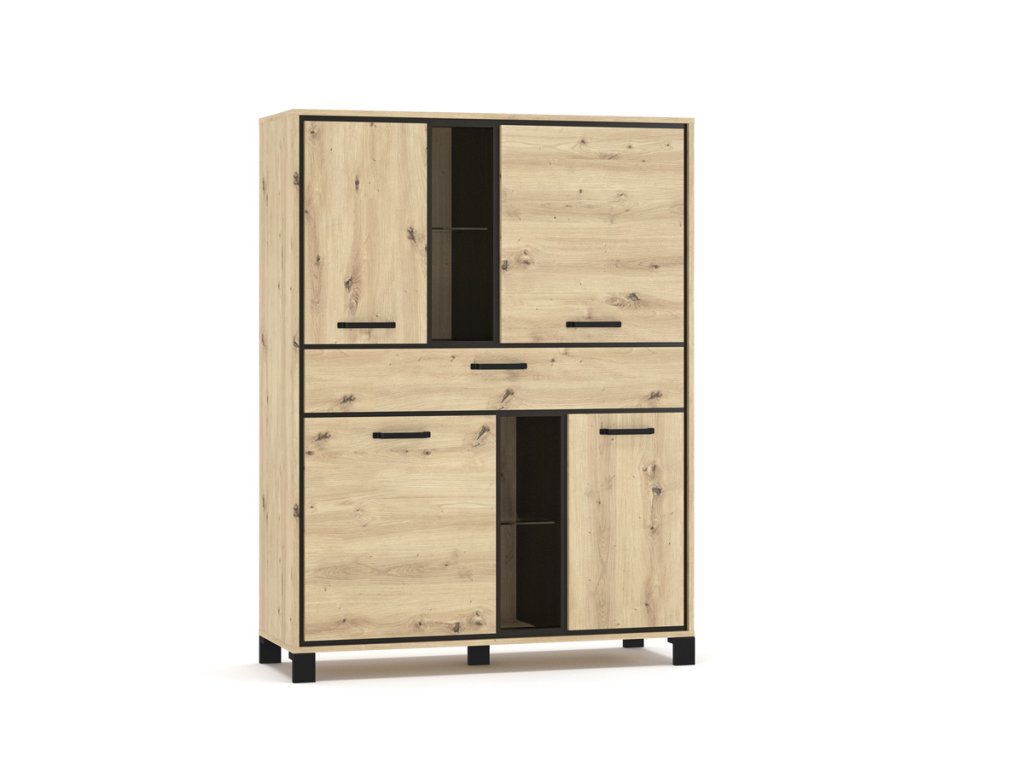 Obývací sektor ZOLNA s atmosférou industriálního stylu tvoří nábytek plný zajímavých detailů. V nabídce je v nadčasovém a stylovém barevném provedení dub artisan s kontrastním orámováním barvy wenge. Součástí sektoru je 4dveřová komoda ZOLNA s jedním šuplíkem. Za otevíravými dvířky se nachází jedna police. Mezi dvířky se nacházejí také skleněné police, kde si můžete vystavit vzpomínkové předměty.