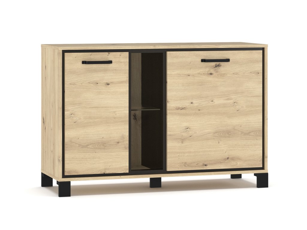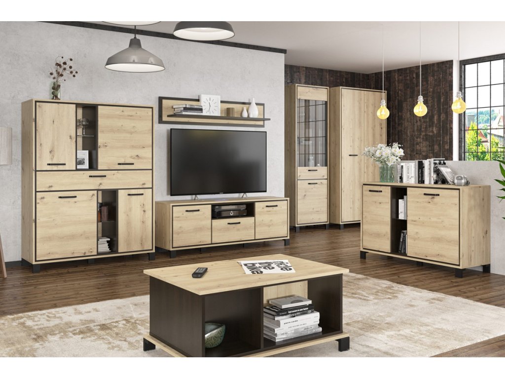 Obývací sektor ZOLNA s atmosférou industriálního stylu tvoří nábytek plný zajímavých detailů. V nabídce je v nadčasovém a stylovém barevném provedení dub artisan s kontrastním orámováním barvy wenge. Součástí sektoru je 2dveřová komoda ZOLNA ve středu se skleněnou policí. Po bocích má otevíravá dvířka s jednou úložnou policí.