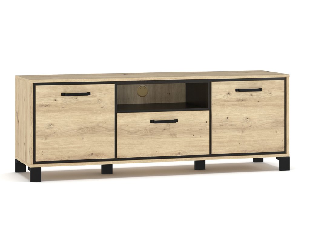 Obývací sektor ZOLNA s atmosférou industriálního stylu tvoří nábytek plný zajímavých detailů. V nabídce je v nadčasovém a stylovém barevném provedení dub artisan s kontrastním orámováním barvy wenge. Součástí sektoru je televizní stolek ZOLNA. Stolek má po bocích dvě otevíravá dvířka, uprostřed šuplík a otevřenou polici. V otevřené polici je otvor pro kabely set-top boxu nebo DVD příjímače.